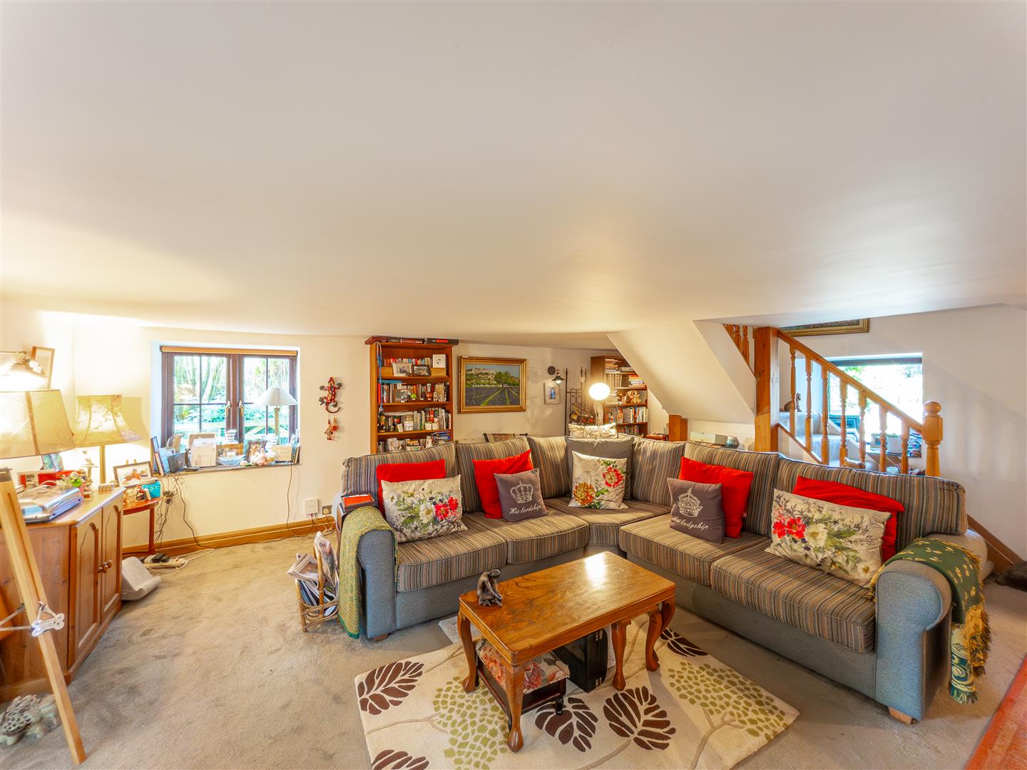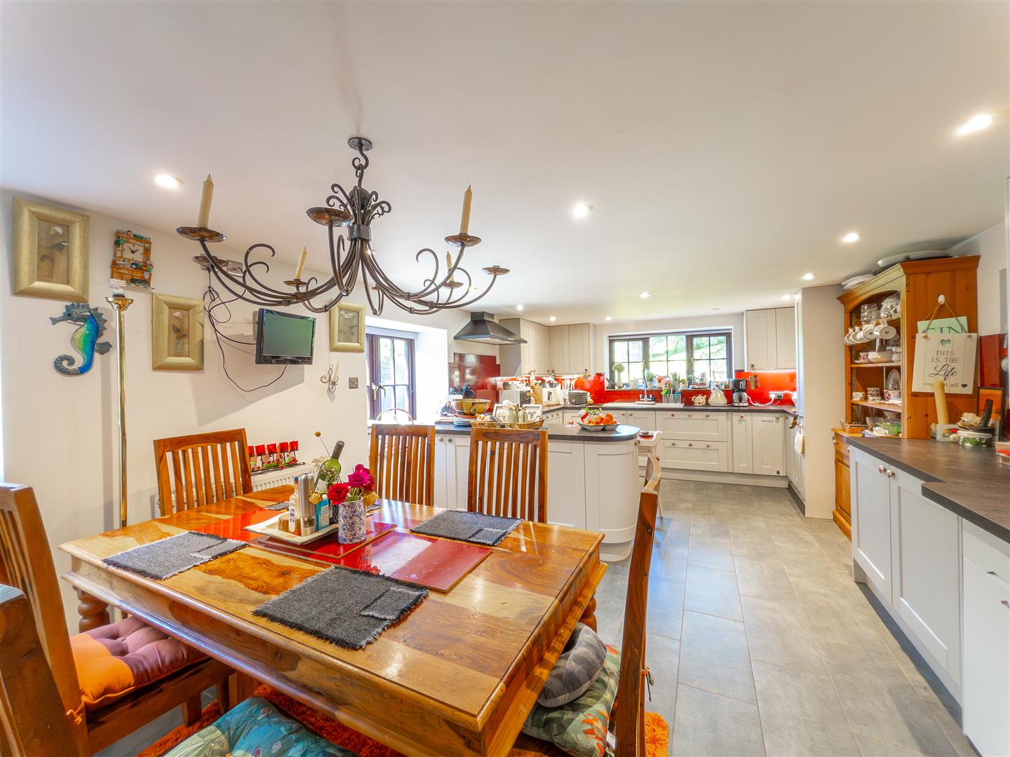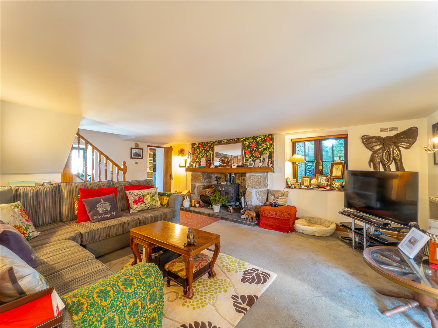 A well proportioned open plan triple aspect room with an impressive local stone fireplace with slate hearth and timber mantle, housing a woodburning stove and providing a lovely focal point for the room. There are windows to the front and side elevations, a recessed storage area, an opening to the staircase to the first floor and a stable door to the conservatory.
