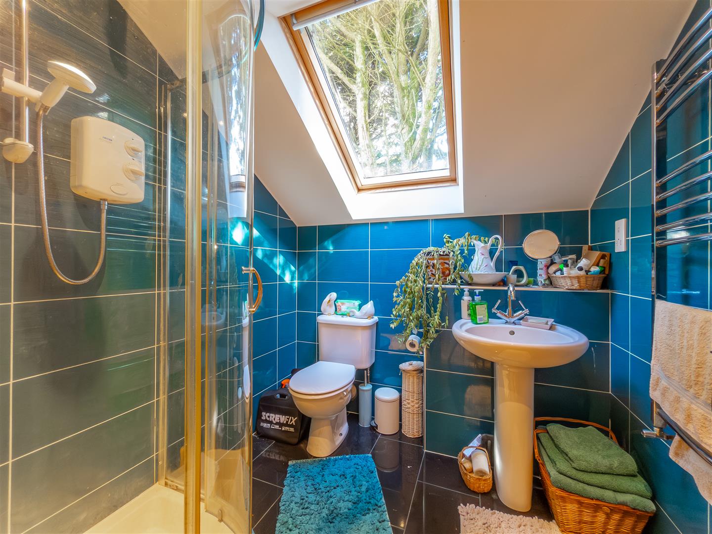 Nicely appointed white suite comprising a low level w.c, pedestal wash hand basin with mixer tap over and a shower cubicle with a sliding door housing an electric shower. These are complemented by stylish polished floor tiling and striking ‘azure’ tiling to the walls. There is a heated ladder style towel rail, an extractor, recessed spotlighting, shaving point and a Velux skylight.