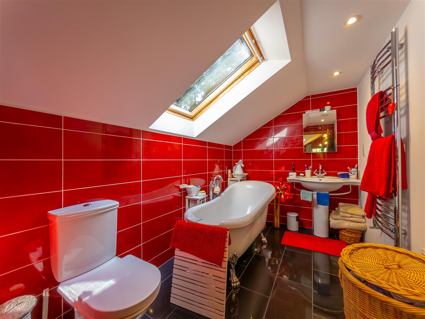 A luxuriously appointed stylish fitted bathroom with a low level w.c, wash hand basin with rail under and a free standing slipper bath. The suite is complemented by polished floor tiling, a ladder style heated towel rail, recessed spotlighting, and a skylight. There is an extractor and contemporary tiling to the walls.