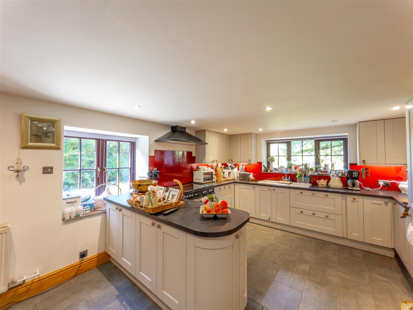 A beautifully appointed open plan farmhouse style kitchen with attractive slate flooring and an array of base cupboards and drawers with matching wall cupboards. These are complemented by contemporary slate effect working top surfaces that incorporate a one and a half bowl sink with drainer and Swan’s neck mixer tap over. Ample space is provided for a slimline dishwasher, washing machine, free standing fridge / freezer and a Leisure ‘range style’ five ring gas cooker with side plate and chimney style hood over. Enhancements include an attractive island unit with curved cupboards, corner carousel unit, a larder style cupboard, recessed lighting and a Worcester oil fired boiler.
