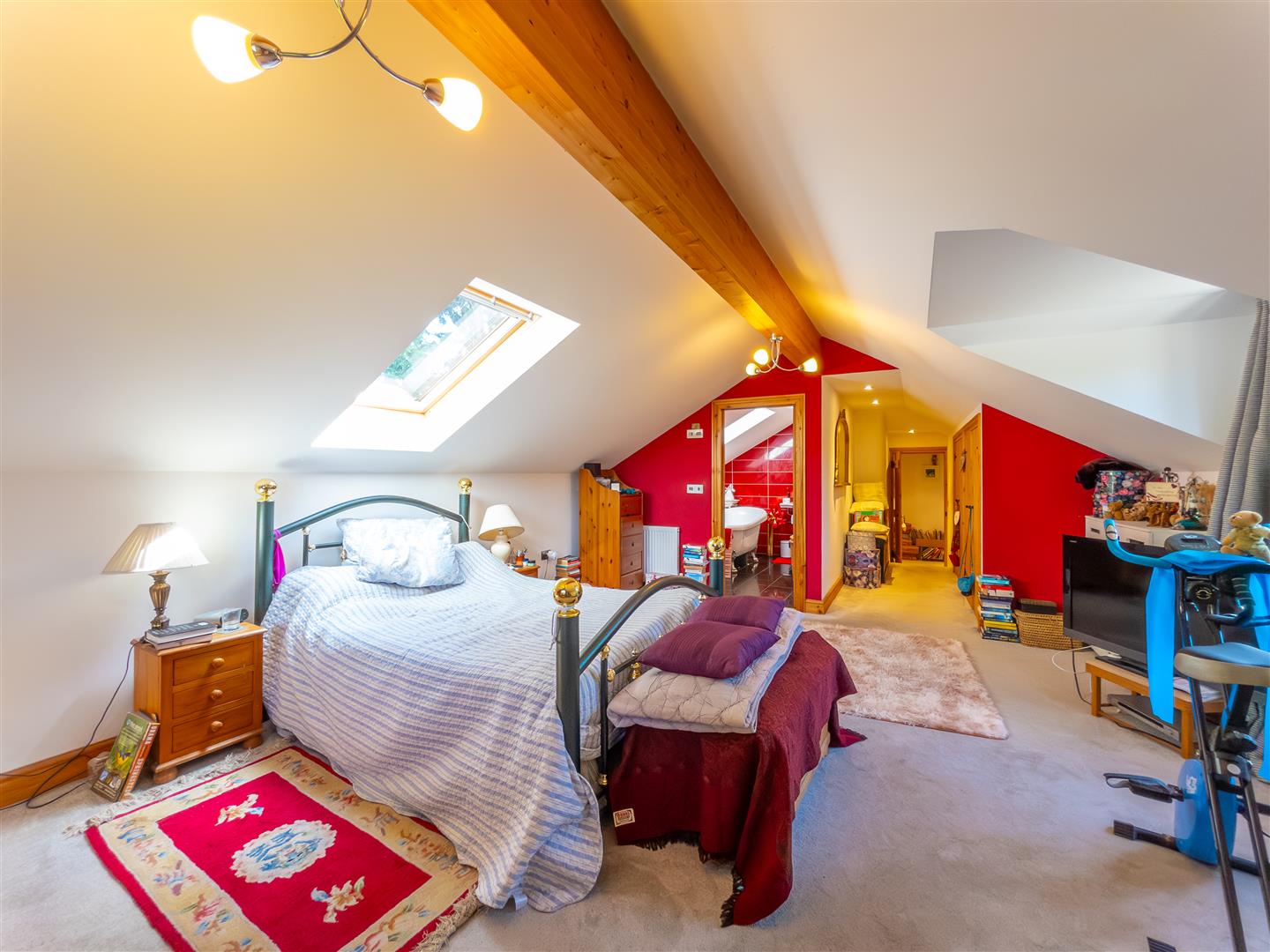 A very spacious comfortable triple aspect double bedroom suite with skylight, attractive light fittings and exposed timber beam. The dressing room area plays host to bespoke built in wardrobes with hanging rails, whilst there are some areas of restricted headroom. The room has an elevated outlook towards the front driveway, gardens and open countryside beyond.