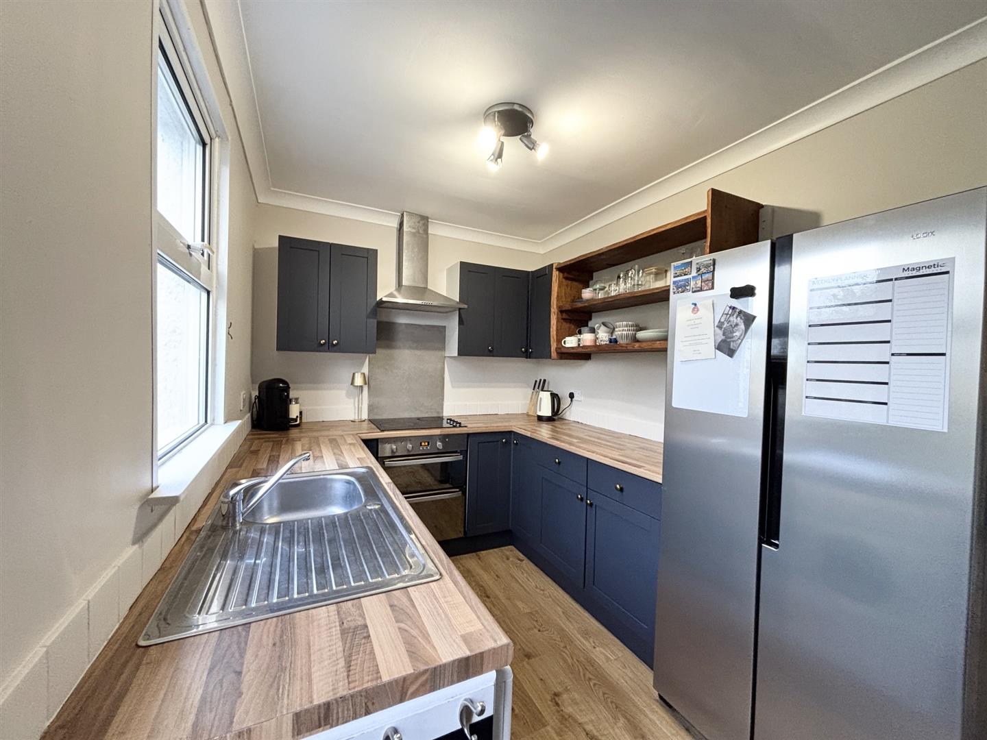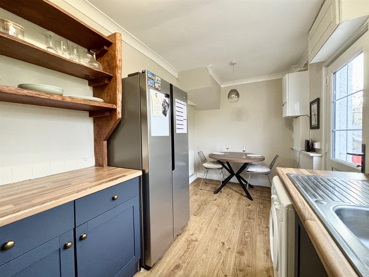 Fitted with a stylish navy blue base and wall units with work surfaces over with brass effect knobs and feature open display shelving, electric double oven with hob over and stainless steel filter and light above, stainless steel sink drainer, space and plumbing for washing machine and space and point for American style fridge/freezer. Breakfast area with space for table and chairs, radiator, wall mounted Vaillant wall mounted combi boiler and door to garden.