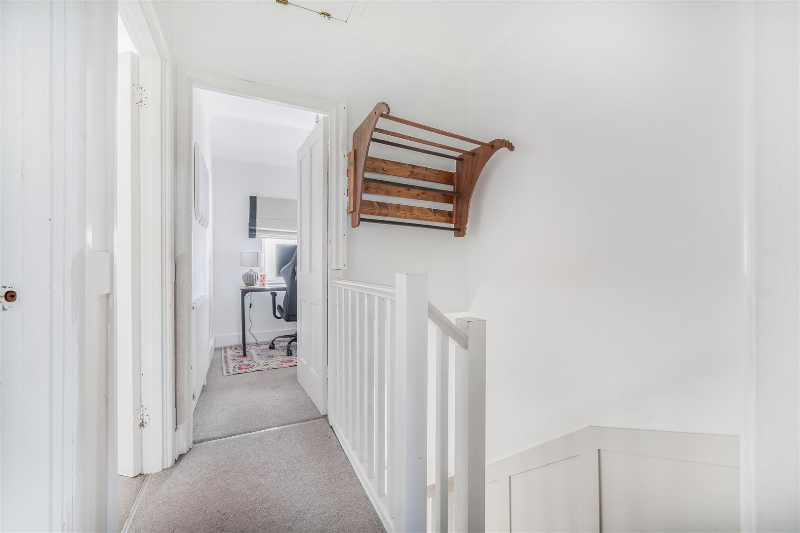 Upstairs, there are two comfortable double bedrooms along with a smaller third bedroom perfect as a nursery or study, complete with clever built-in storage. The bathroom is beautifully appointed, finished in a contemporary yet timeless style that complements the rest of the home perfectly.