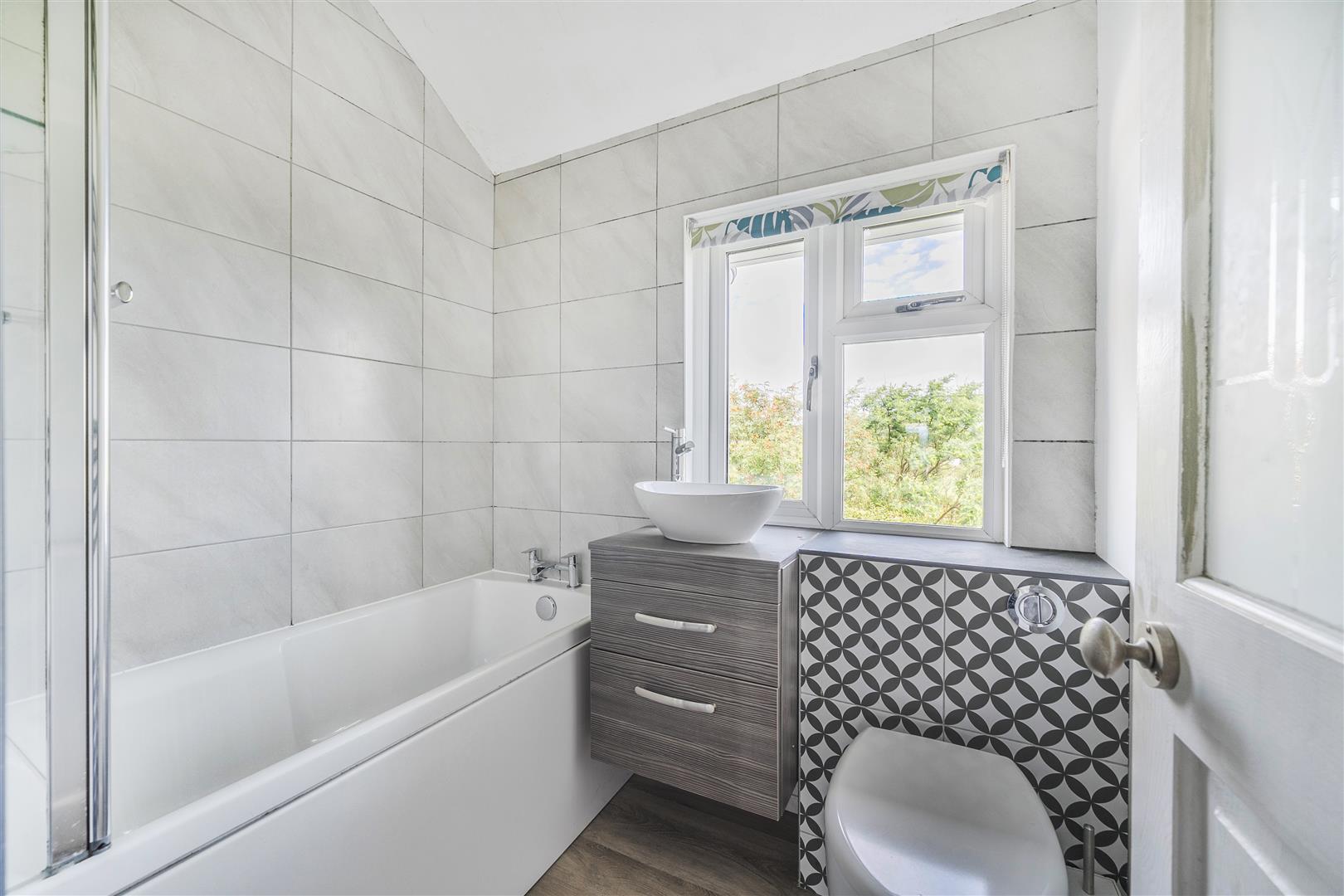 With suite comprising of a bath with tiled surround and a chrome effect mixer shower, concealed cistern W.C. and stylish wash hand basin bowl set in vanity unit with mixer tap and storage below. Window to rear overlooking the garden and offering a rural outlook. Anthracite ladder style radiator.
