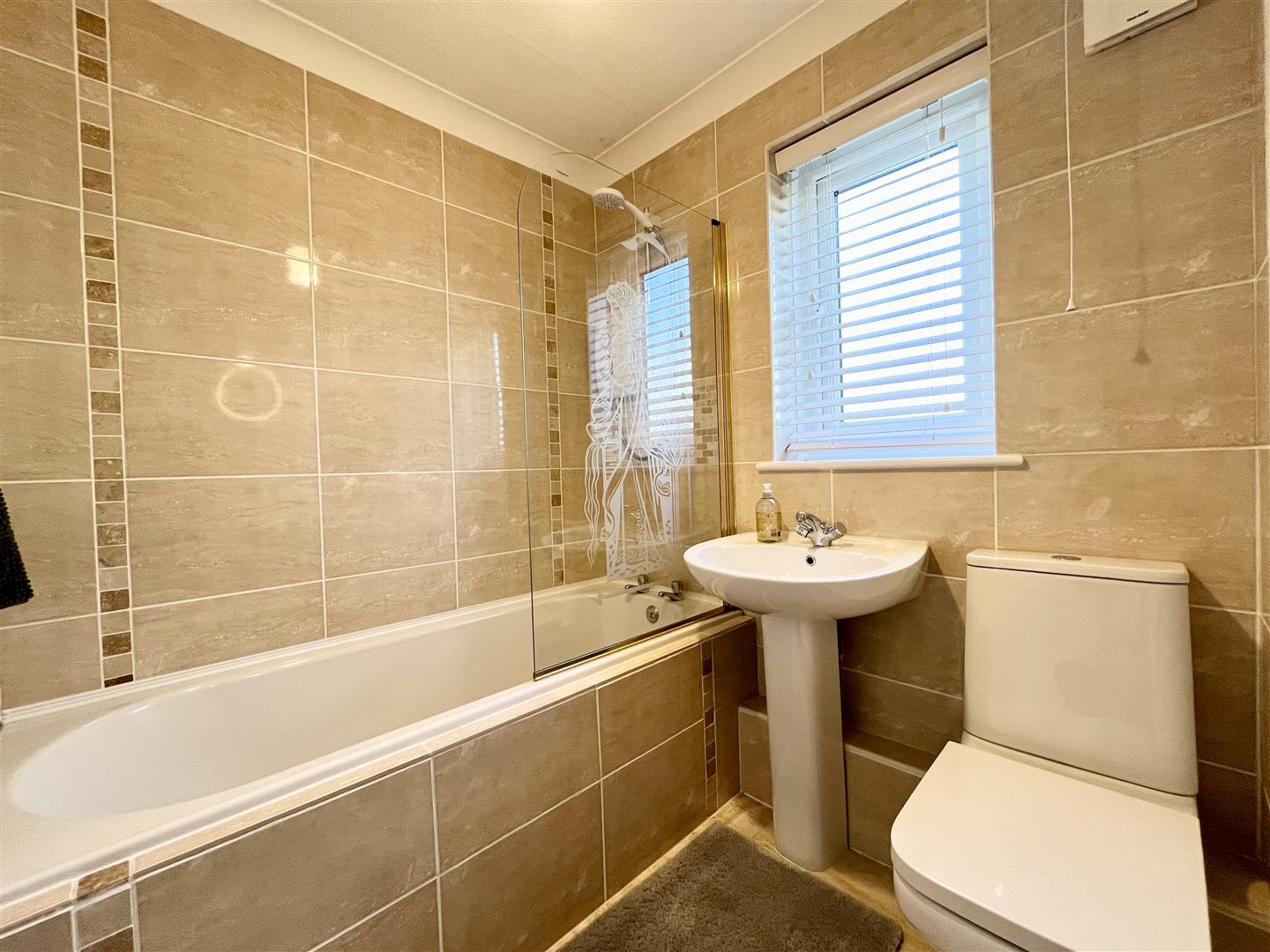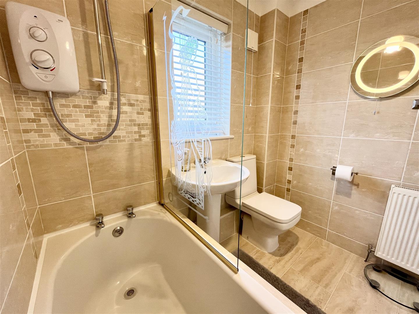A fully fitted suite with bath with electric shower over, radiator, pedestal wash hand basin, low level wc, obscured double glazed window to the side and extractor fan.