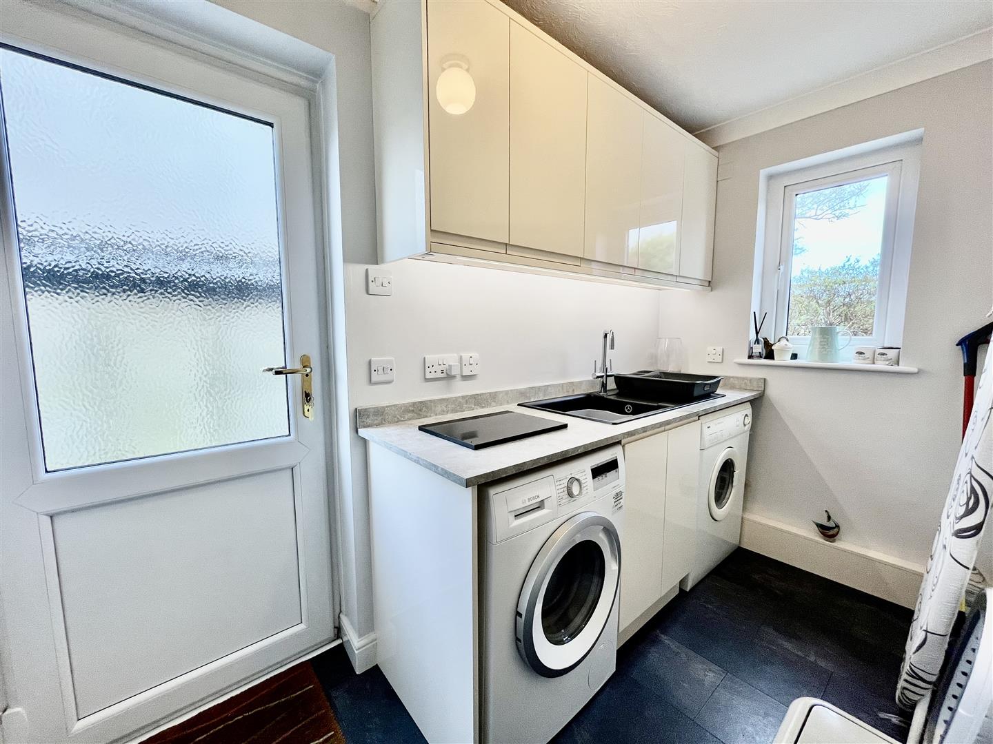 A practical utility room with work surfaces incorporating a sink with mixer tap. There is space for a washing machine and tumble dryer, along with additional room for storage or further appliances if required. A patio door to the side offers easy external access, while an integral door leads directly into the garage, adding to the homes overall convenience and functionality.