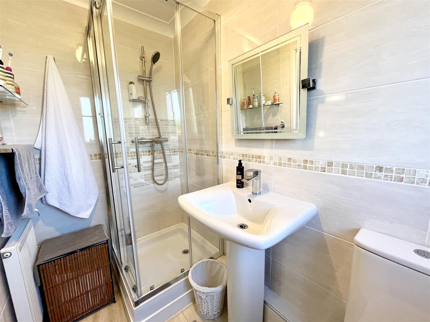 A modern fitted suite with walk in shower cubicle, radiator with towel rail over, low level WC, pedestal wash hand basin and obscured window to the rear.