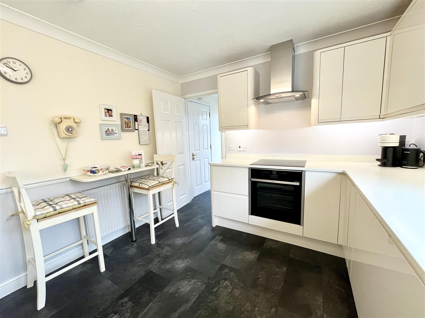 A well appointed, fully fitted kitchen featuring a range of work surfaces incorporating a sink with mixer tap, complemented by a selection of wall and base units and drawers providing plenty of storage. The kitchen is equipped with a four ring induction hob with cooker below and extractor hood over, along with space for an under counter fridge/freezer. Additional features include a convenient breakfast bar for casual dining, a radiator, and under-cupboard lighting enhancing both practicality and ambience. A window overlooking the garden allows for plenty of natural light while offering a pleasant outlook.