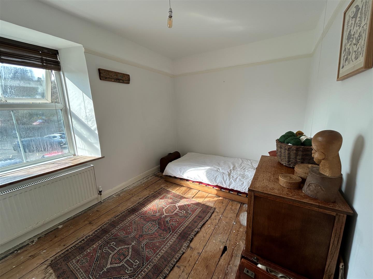 With picture rail, stripped wood flooring and window to the front aspect.