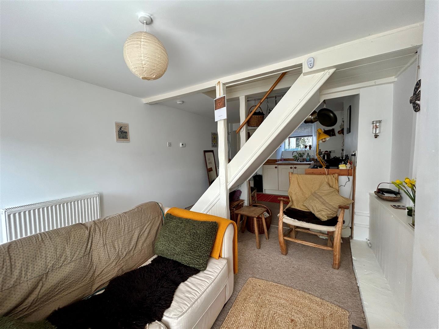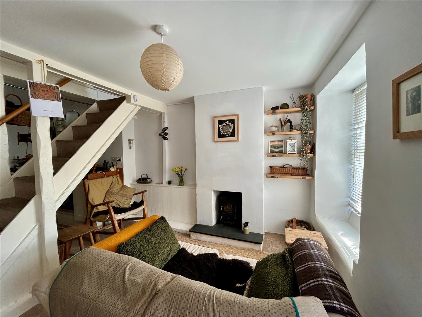 A lovely space with log burner set on a slate hearth, window to the front aspect with a window seat arrangement whilst stairs rise to the first floor with an opening through to-