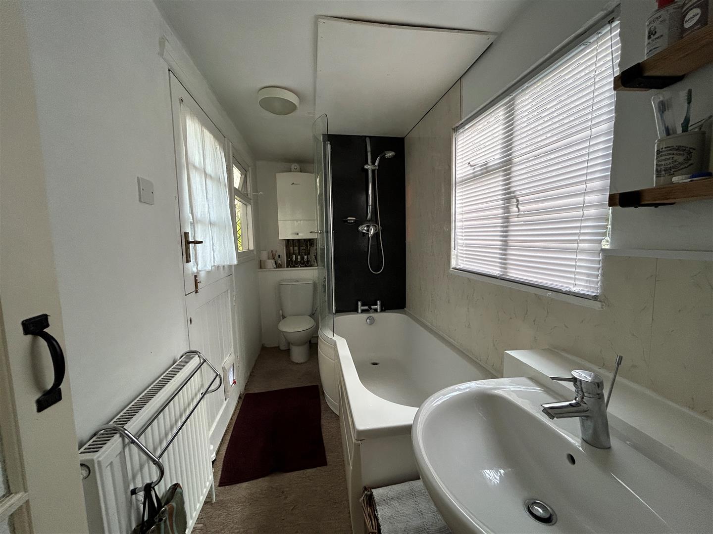 Being nicely appointed with a white suite that includes a P-shaped bath with shower screen at one end and easy clean splashbacks to the rear and side, wash hand basin, dual flush W.C., window to the side aspect, feature shelving, the room houses the Worcester mains gas boiler and there is a further window along with a stable style half glazed door leading to the rear courtyard.