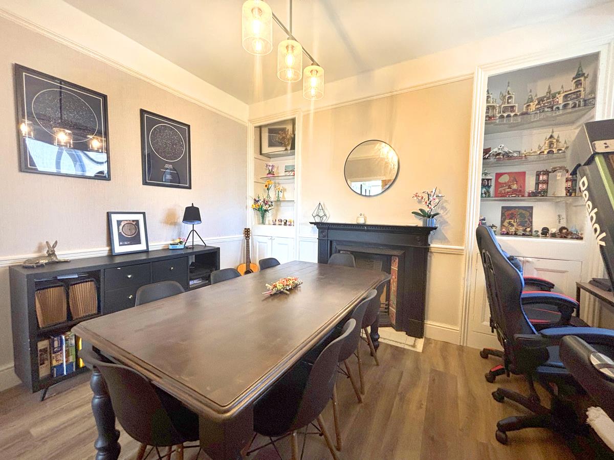 With a radiator, serving hatch to the kitchen. Borrowed light window to the utility room, decorative fireplace (not currently in use), with storage cupboards and open display shelving to the either side.