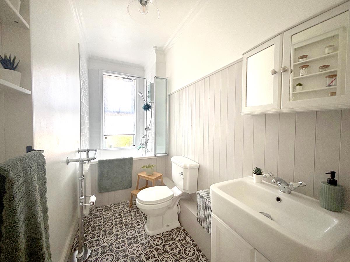 Featuring a square soaking tub with mixer tap, with telephone style shower attachment. A Mira Azora electric shower over with drench head and hand held wand. Low level w.c., wash hand basin in vanity unit with cupboard below. A period style radiator with integrated heated towel rail and a window to the rear.