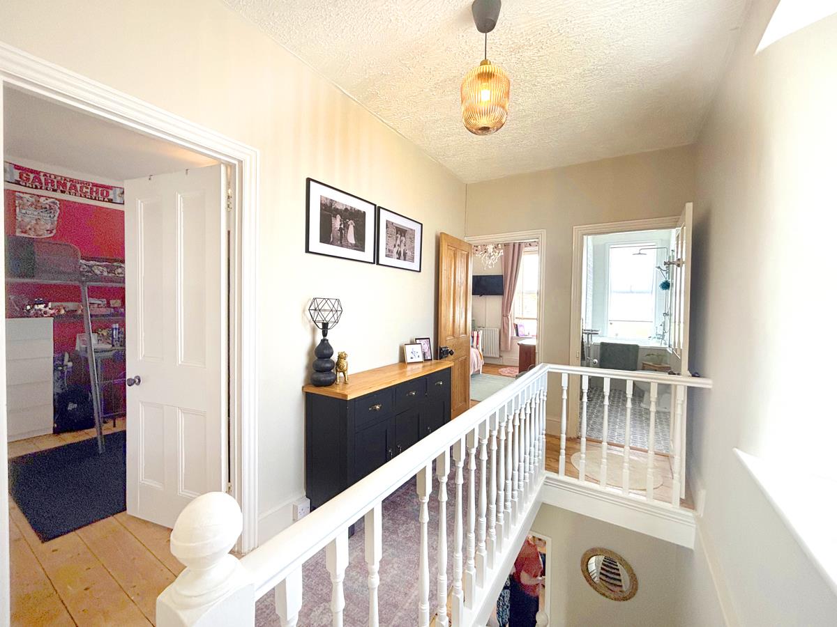 Upstairs, the galleried landing is bathed in light and accesses three well-proportioned bedrooms. The standout master bedroom is exceptionally spacious, boasting a beautiful bay window overlooking the garden and excellent built-in storage. The first floor also features characterful exposed floorboards throughout and a luxuriously appointed family bathroom.