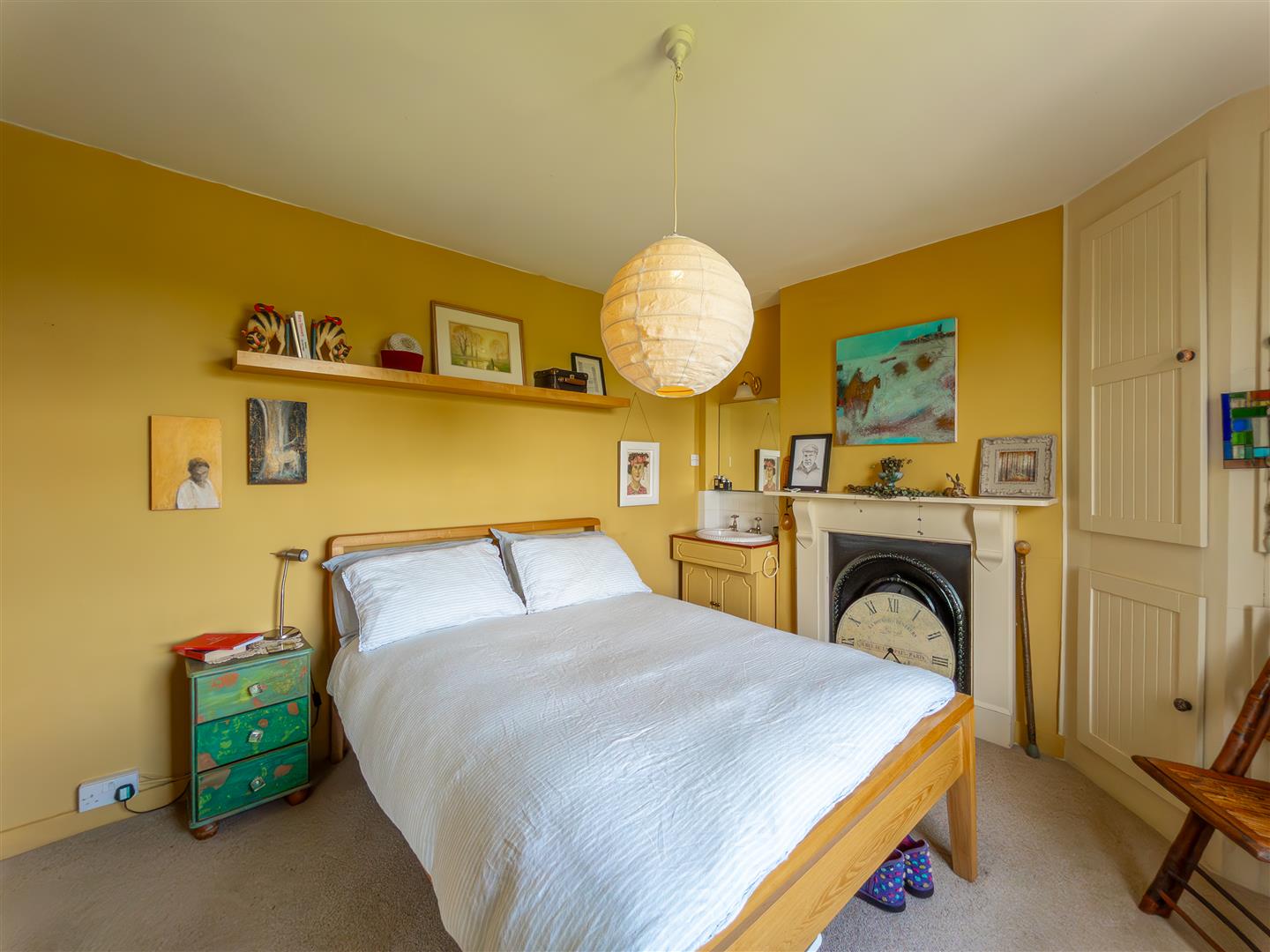 A double bedroom with a decorative fireplace, bespoke shelving and storage and a sash window to the front aspect.
