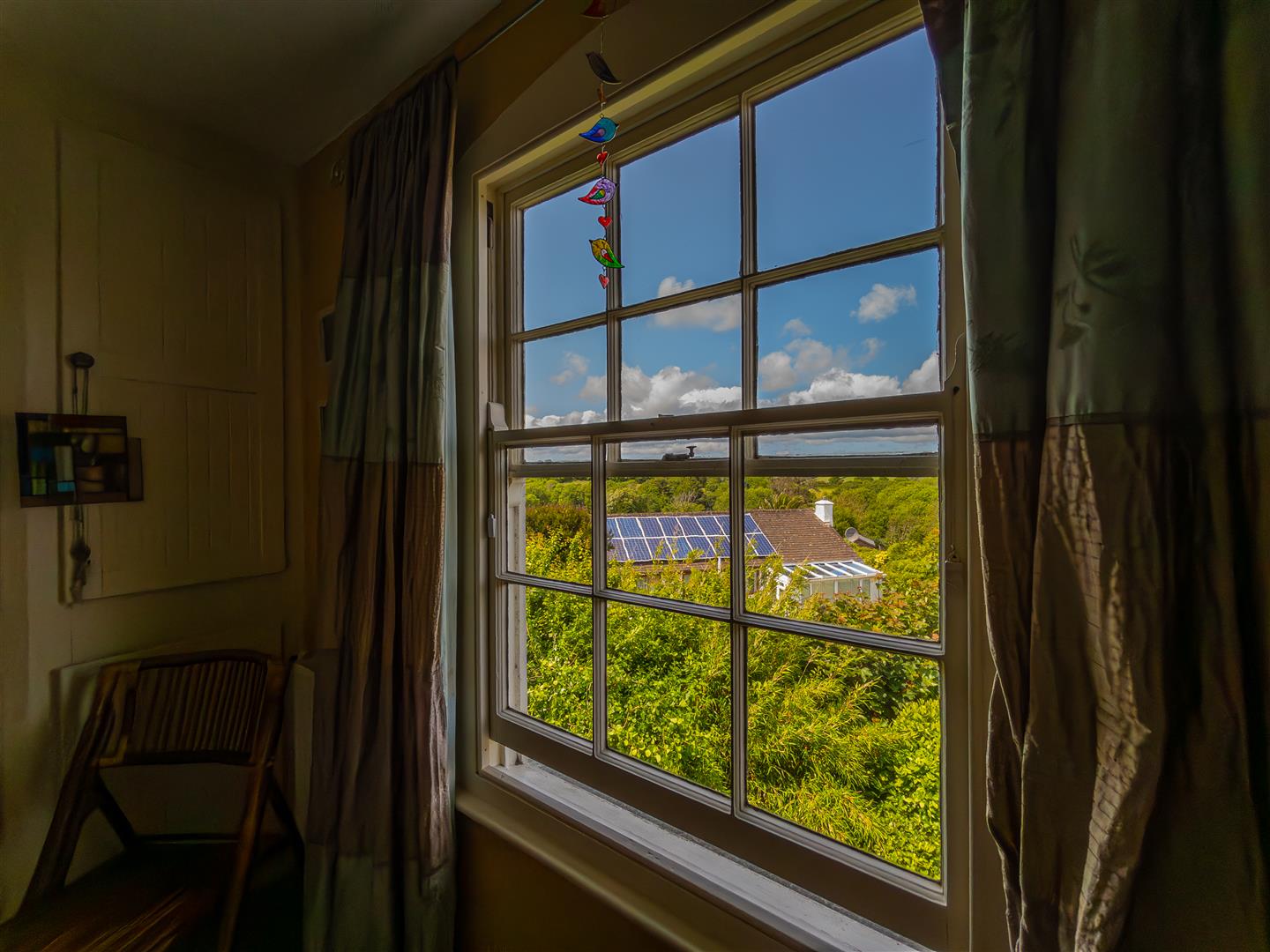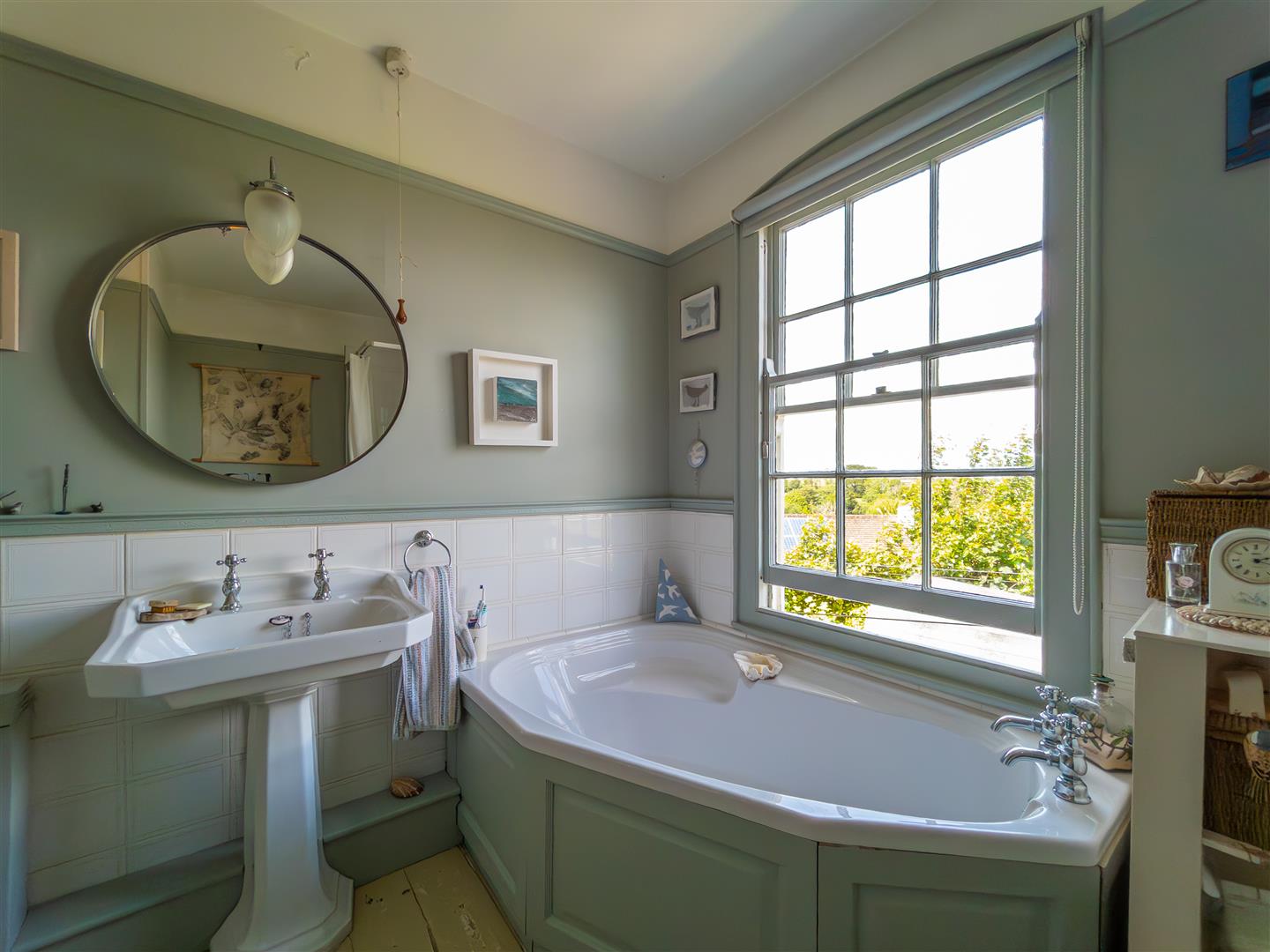Nicely appointed with a suite comprising a low-level w.c, a pedestal wash hand basin, a tiled corner shower unit with thermostatic shower and rain head attachment, and a panelled corner bath with seat. There is an electric heater, a heated towel rail, authentic painting wooden floorboards and a large sash window with a lovely outlook to the rear towards Falmouth and the Roseland beyond.
