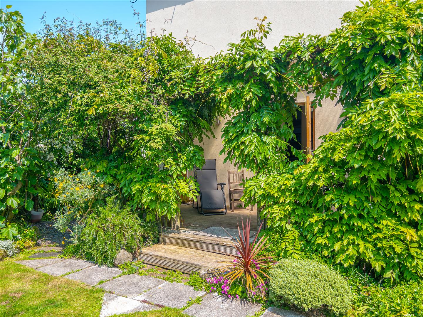 A slate chipped pathway leads around to the rear garden and rear decking area.