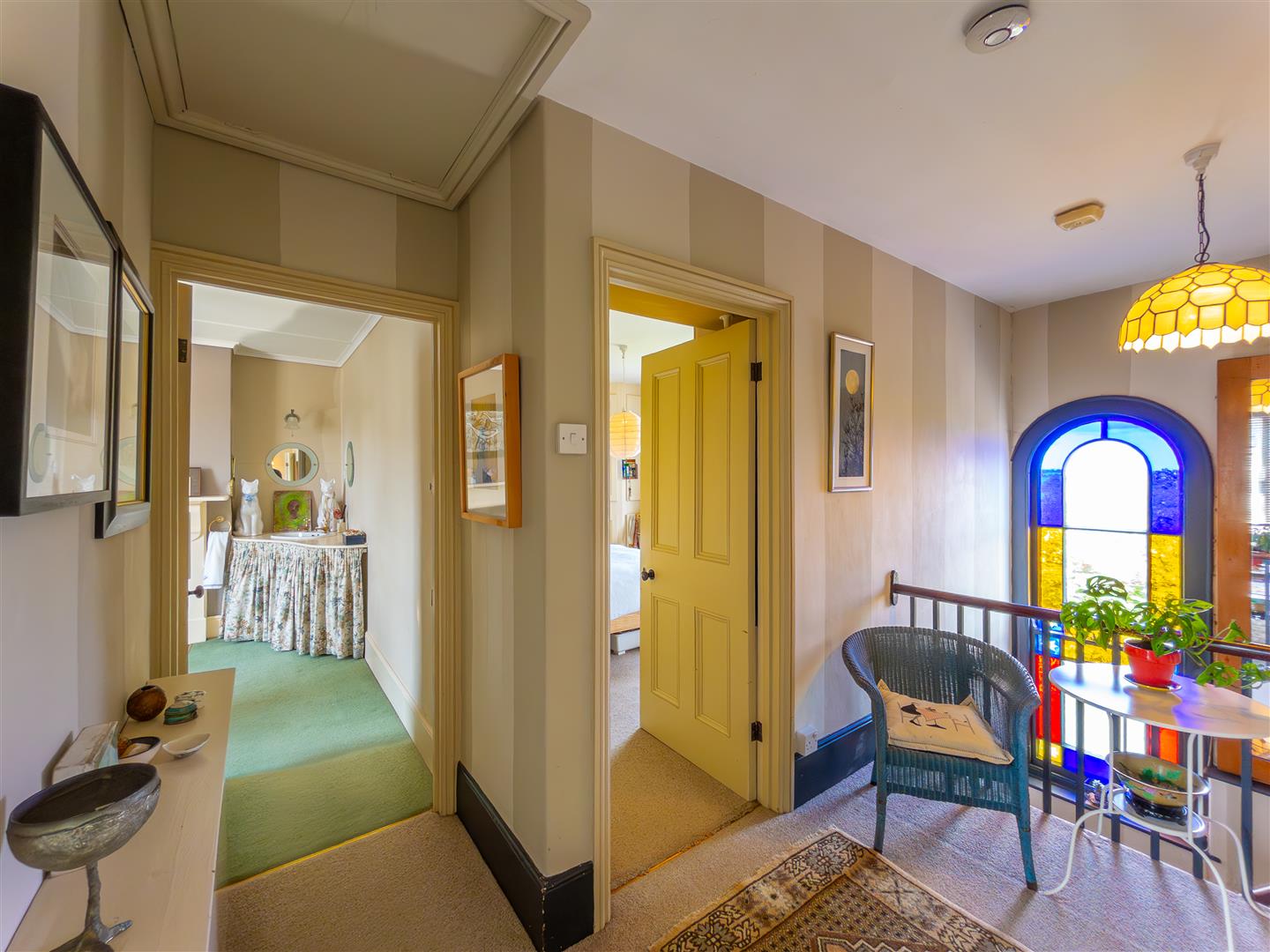 There is an impressive staircase with striking coloured glass feature window rises to the first floor.