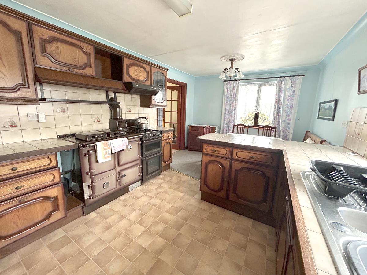 Comprising a wood effect kitchen with tiled effect worktops that incorporate a one and half bowl stainless steel sink drainer unit with mixer tap. There are windows to the front and side aspects, a Rayburn Supreme oil fired oven, gas cooker (both Rayburn and gas cooker are not tested). With a mix of cupboards and drawers under, wall cupboards over, a peninsula unit and a space is provided for a refridgerator. A glazed door leads to the lounge.