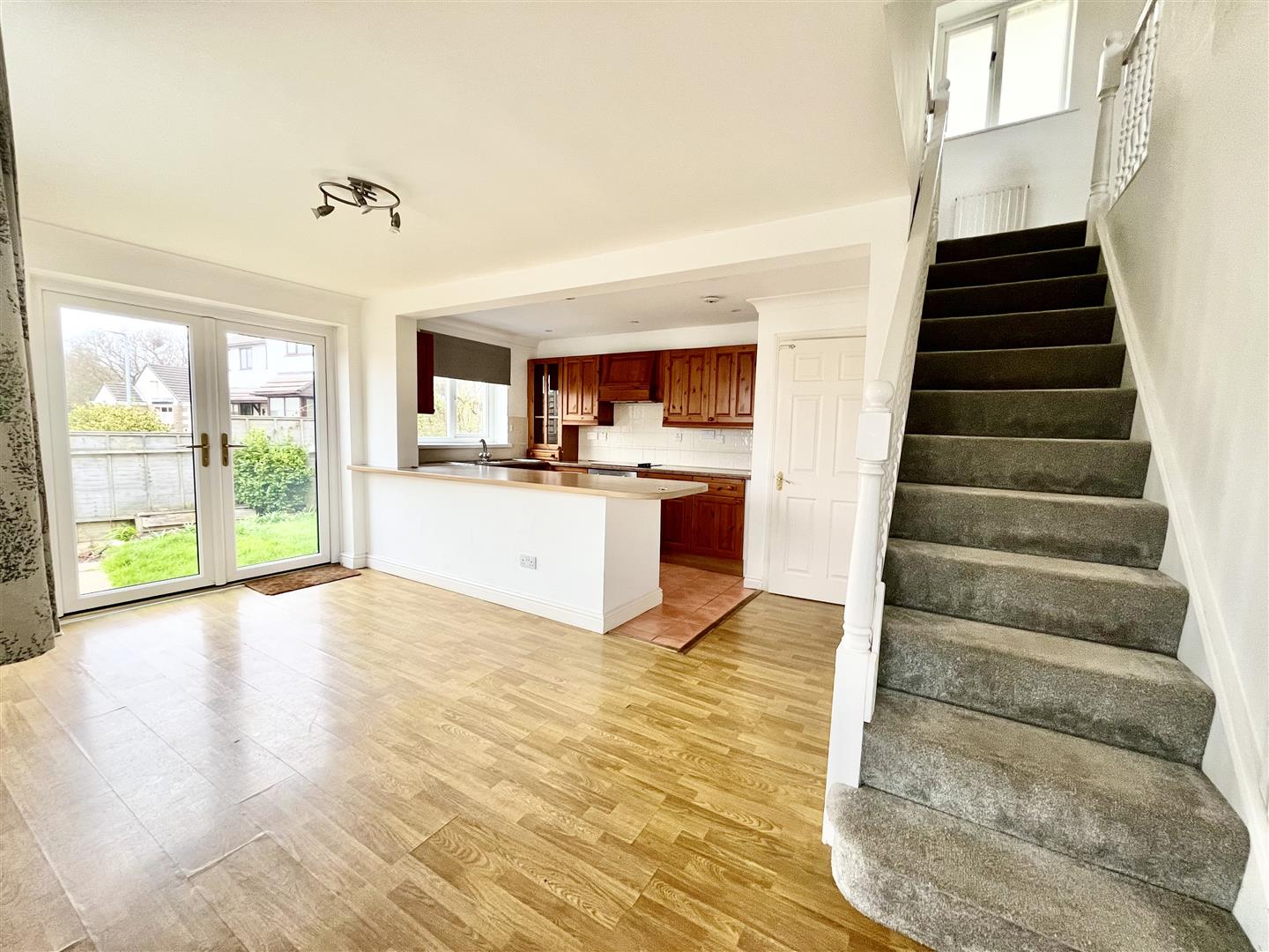 A spacious room with kitchen area fitted with a range of base and wall units with work surfaces over with stainless steel sink and drainer with mixer tap, fitted electric oven and hob with filter and hood over, window to side overlooking the garden and useful breakfast bar area, dining area with radiator, window to front and double doors to side accessing the garden. Stairs rising to the first floor, door to lounge and door to
