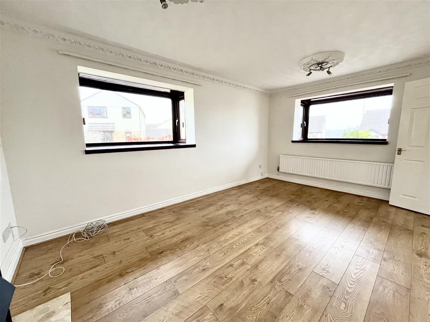 A dual aspect room with two bay windows one to the front and one to the side, radiator and coal effect fire in decorative surround.