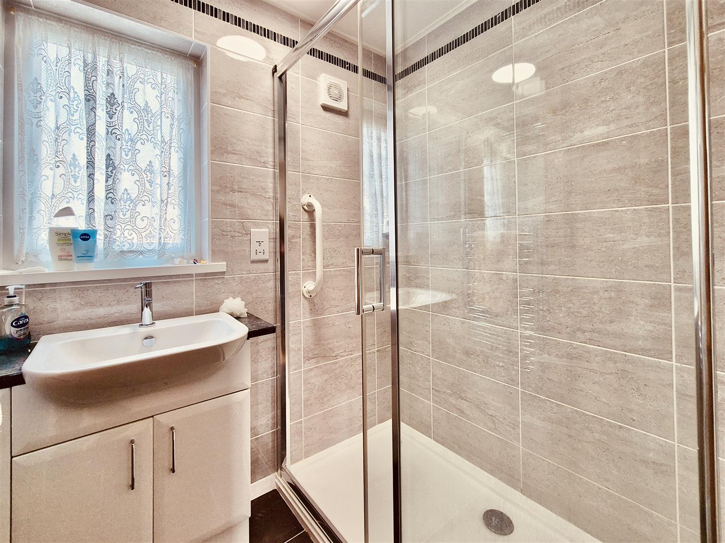 Being tiled to the floor and walls with a walk-in tiled double shower cubicle, with chrome effect domestic hot water shower. Wall mounted wash hand basin in vanity unit, with useful storage cupboard below and chrome effect ladder style radiator. Wall mounted mirror and obscured window to the front.