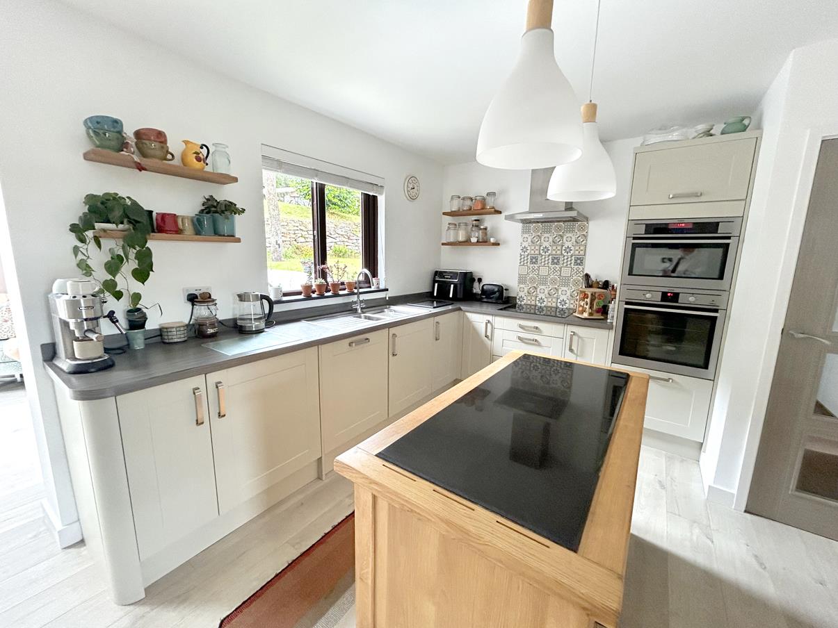 From the kitchen area a glazed feature door leads to the -