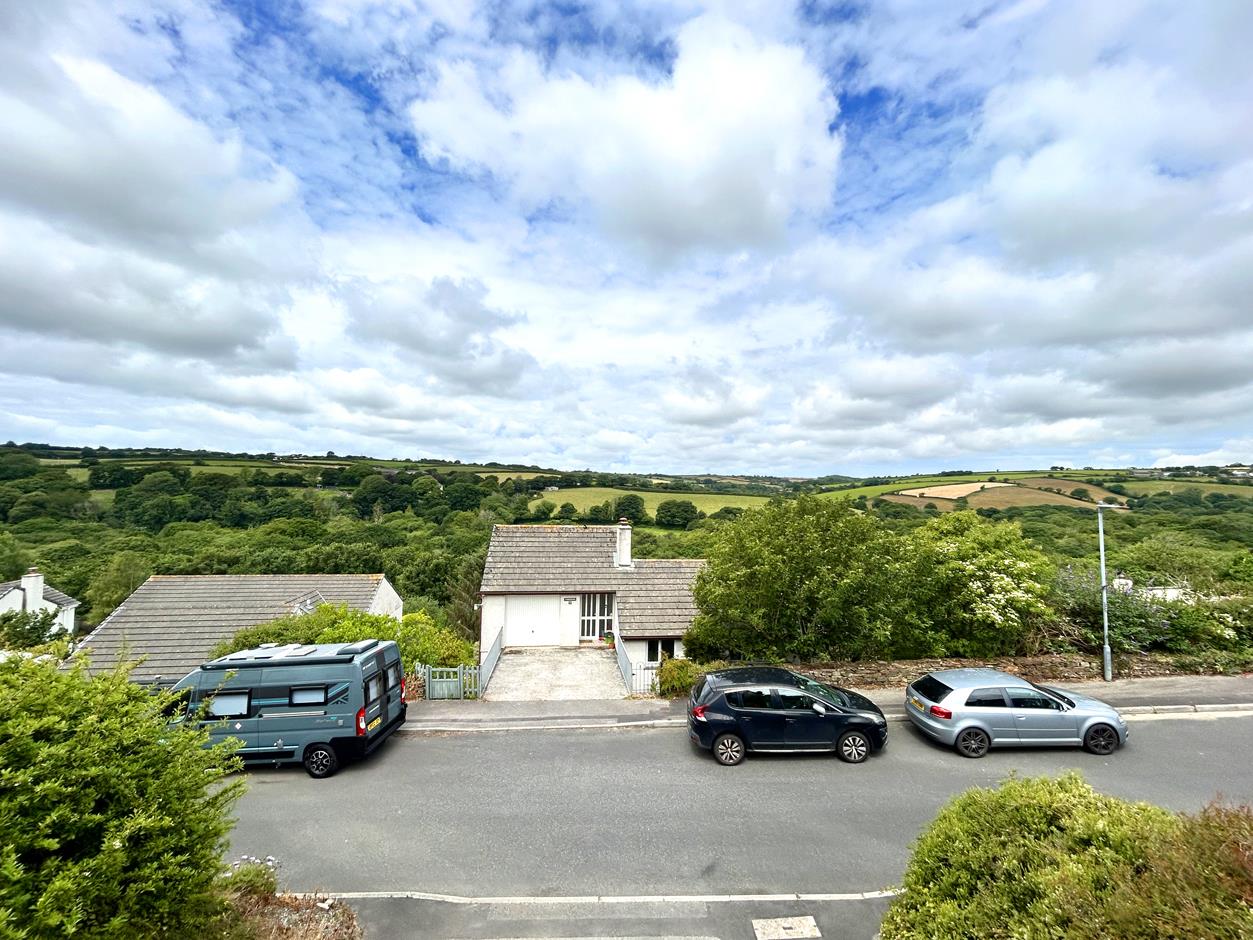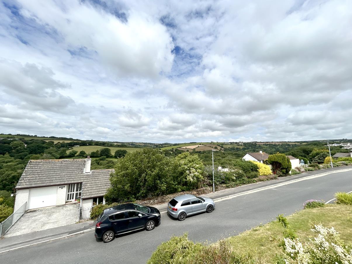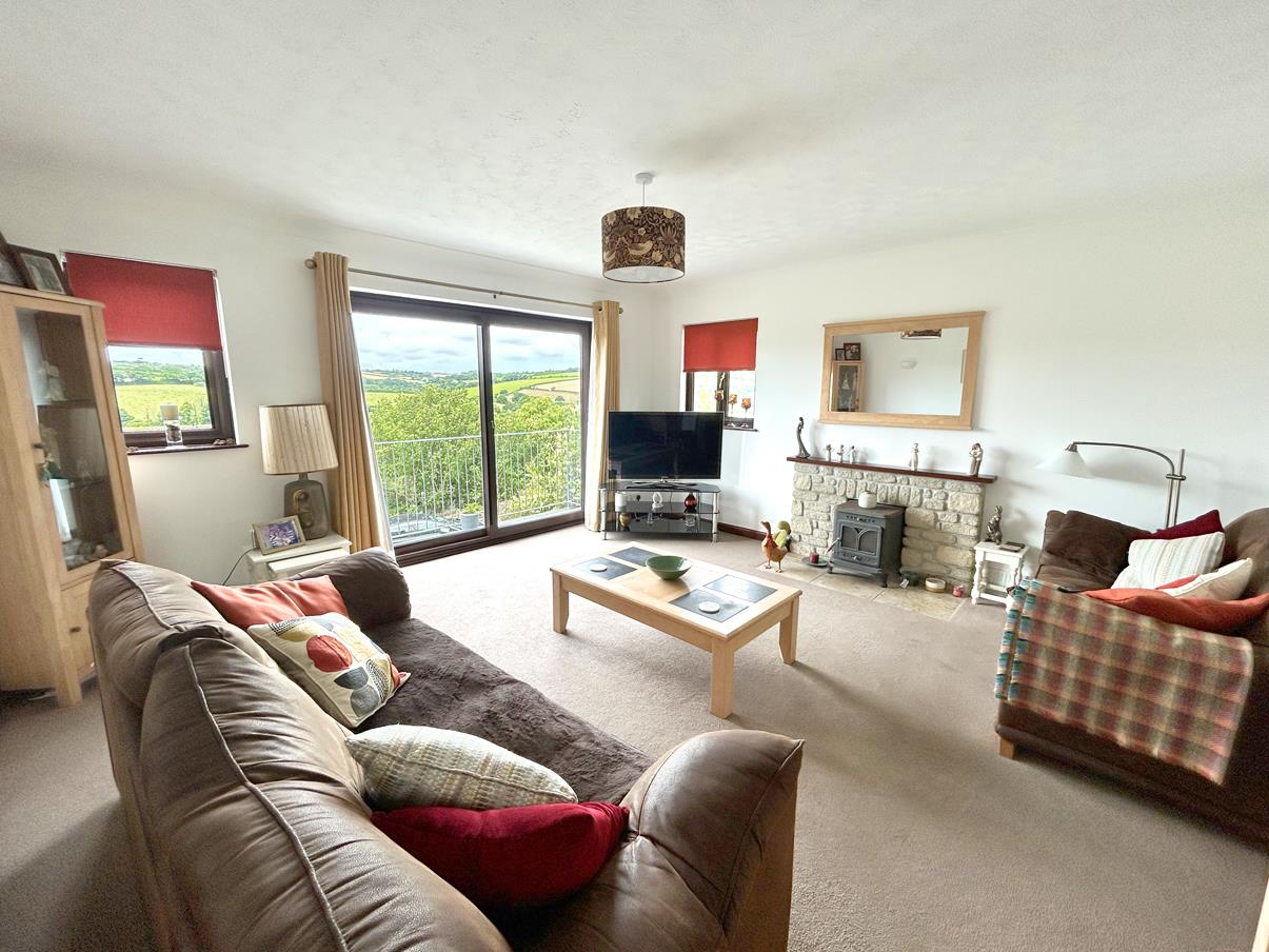 A lovely space with fireplace with the room being lit by a mixture of wall and ceiling pendant lighting. A glazed sliding door leads out on to the balcony seating area with quite wonderful views, over the top of other properties, the Cober Valley onwards to rolling Cornish countryside beyond. An ideal space to enjoy a sundowner whilst watching the sunset from this westerly aspect.