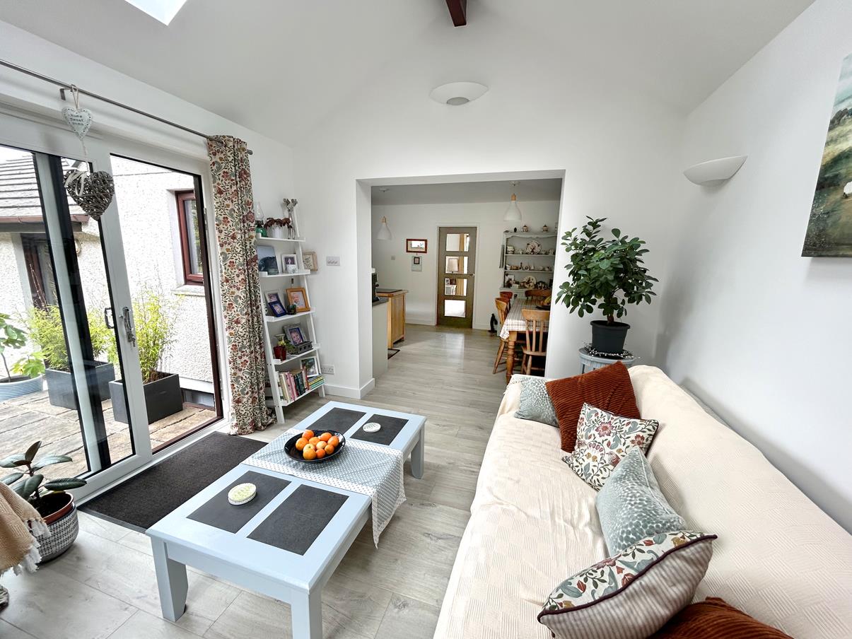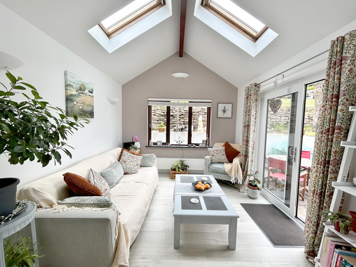 A lovely airy space with vaulted ceilings incorporating two skylights. Glazed patio doors lead out to on to the rear garden and patio seating area.