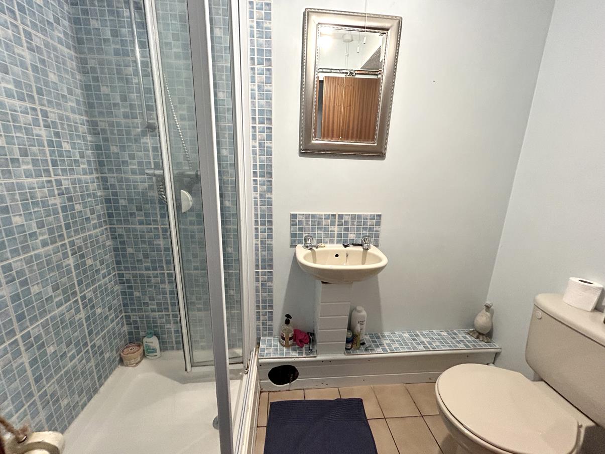 With glazed shower cubicle having tiled splash back, wash handbasin with tiled splash back, close coupled W.C., extractor, tiling to the floor.