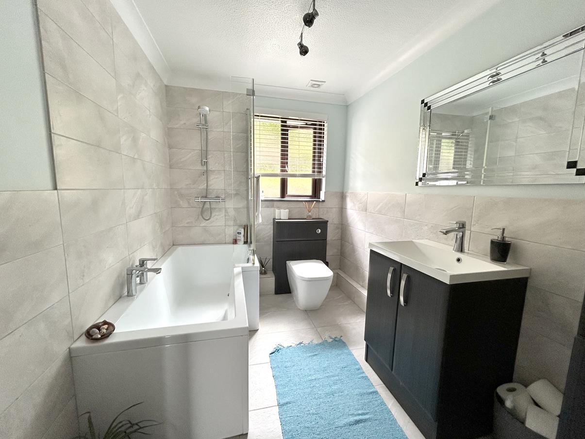Well appointed with a suite that comprises a 'P' shaped bath with shower over and attractive tiled splashbacks and glass screen. Close coupled W.C. with concealed cistern, wash handbasin set into a vanity unit with storage under, extractor fan, ladder style chrome towel radiator, window to the rear aspect and attractive tiling to the walls and floor.