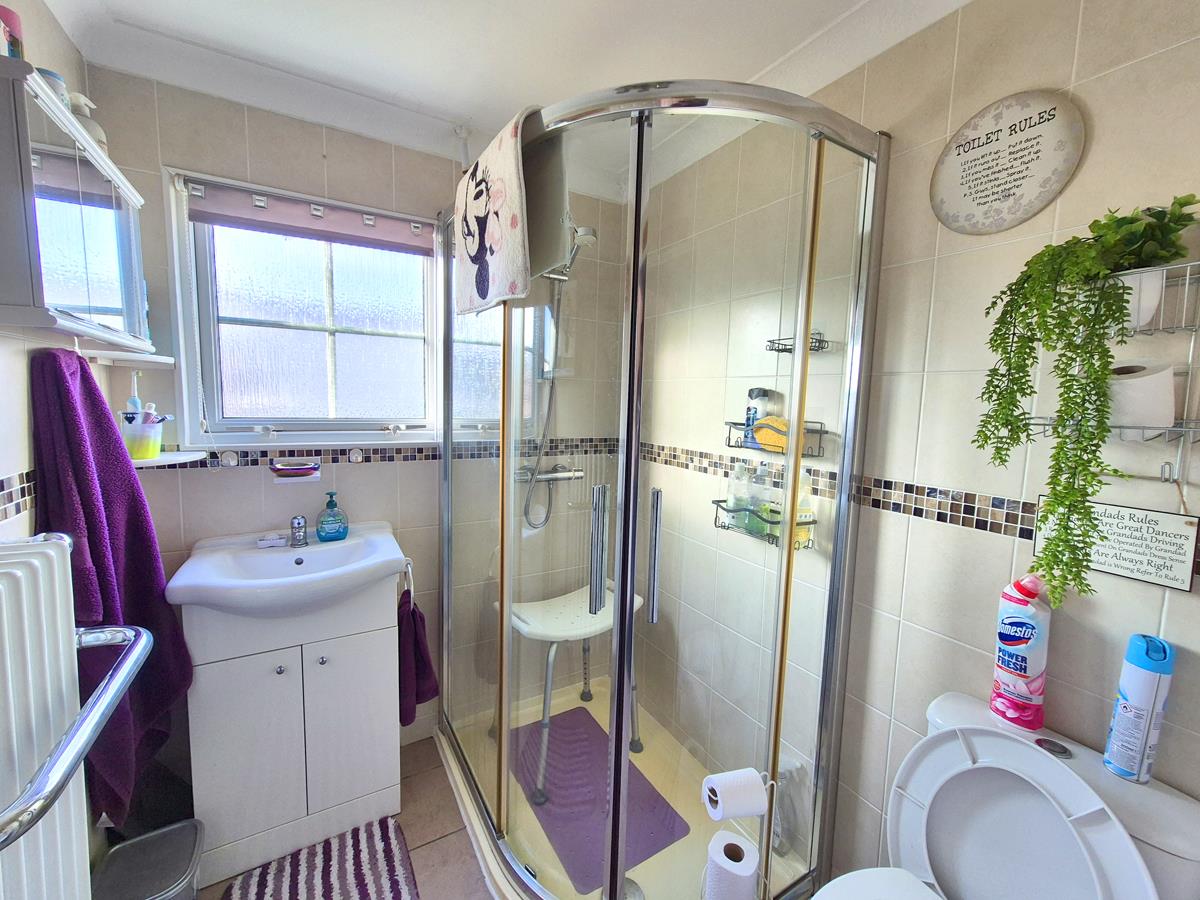 Comprising a shower, close coupled W.C. and a wash basin with mixer tap over and cupboards under. There are tiled walls and a tiled floor.