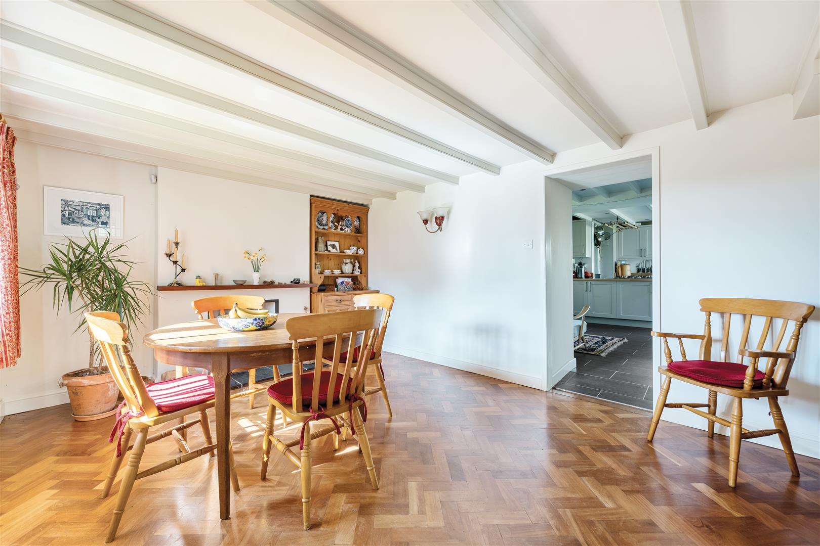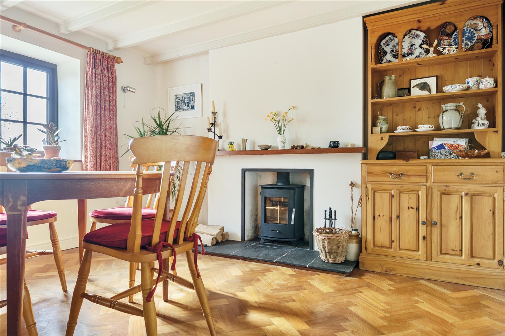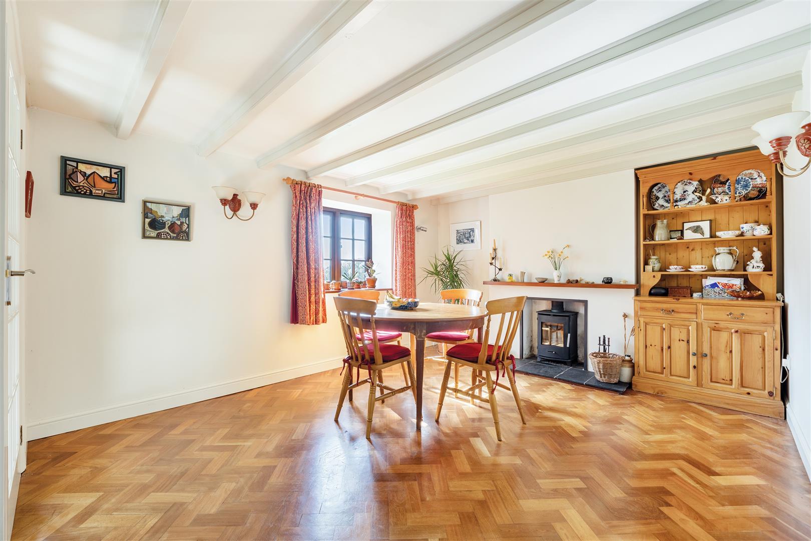 With striking wooden parquet flooring and an attractive fireplace with slate hearth and wooden mantle, playing host to a wood burning stove. There is stylish wall lighting and a window with an outlook to the front garden. Glazed panel door to;