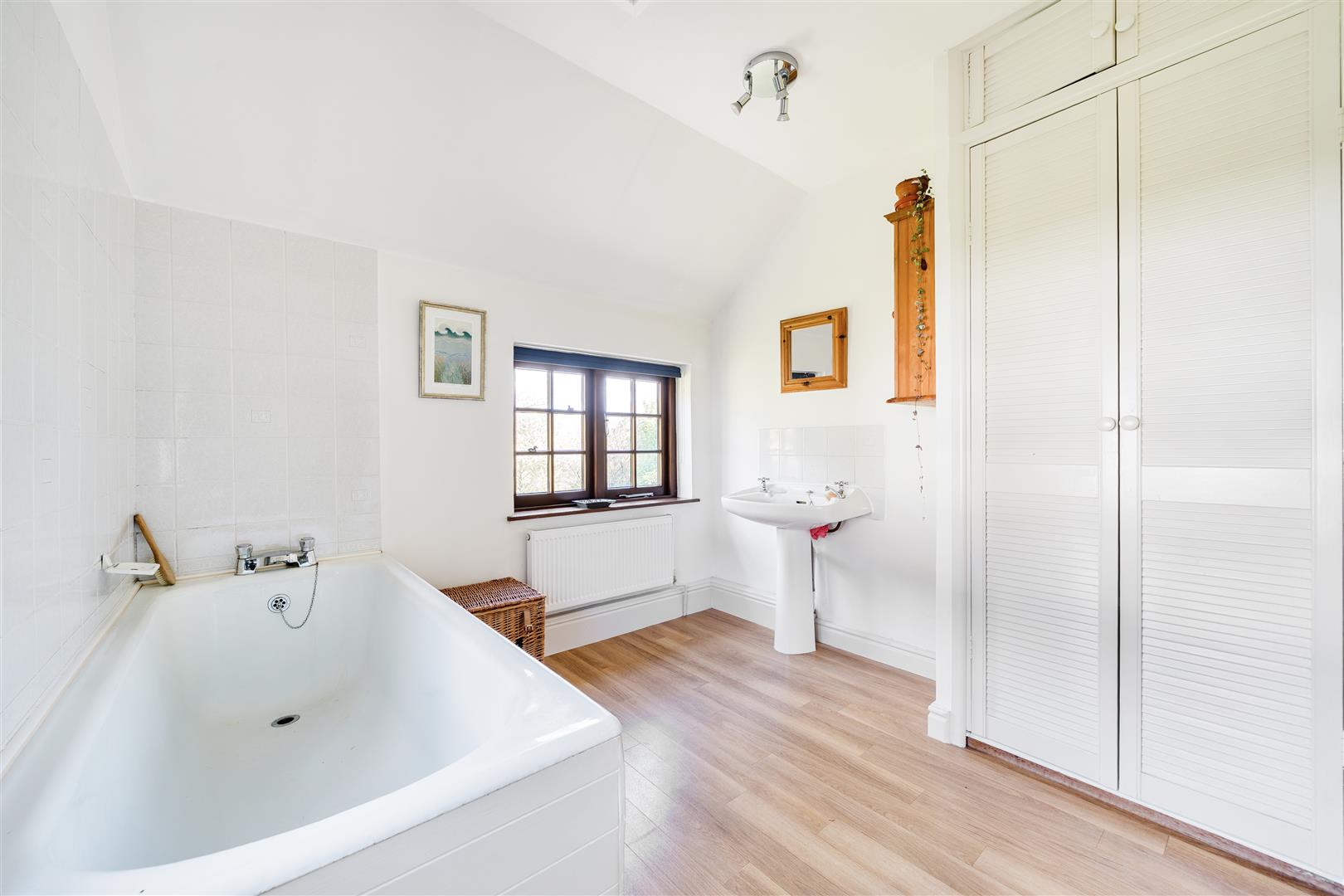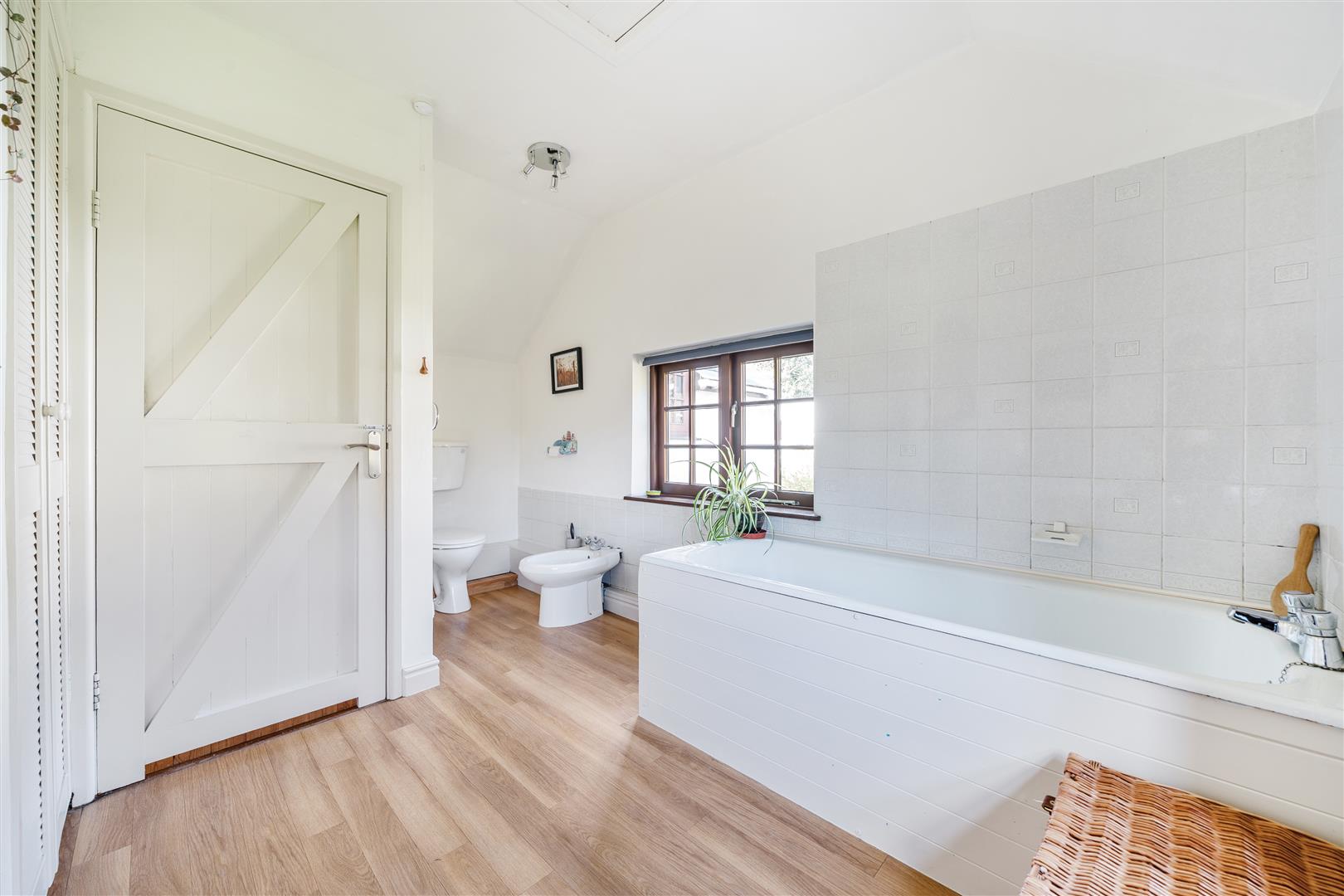 Generously sized with fitted white suite comprising a low-level w.c, bidet, pedestal wash hand basin with tiled splashback and a panelled bath with a tiled surround. There is a spotlighting arrangement, a trap hatch to the roof void, louvered doors to the airing cupboard with slatted shelving and wood effect vinyl flooring. Dual aspect with windows to patio area and garden and grounds.