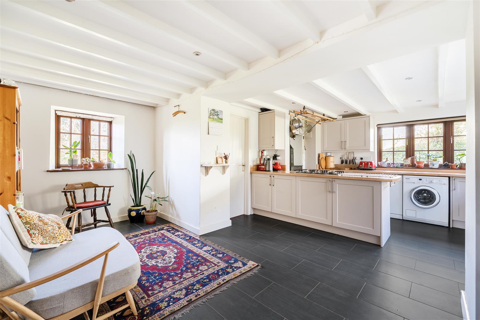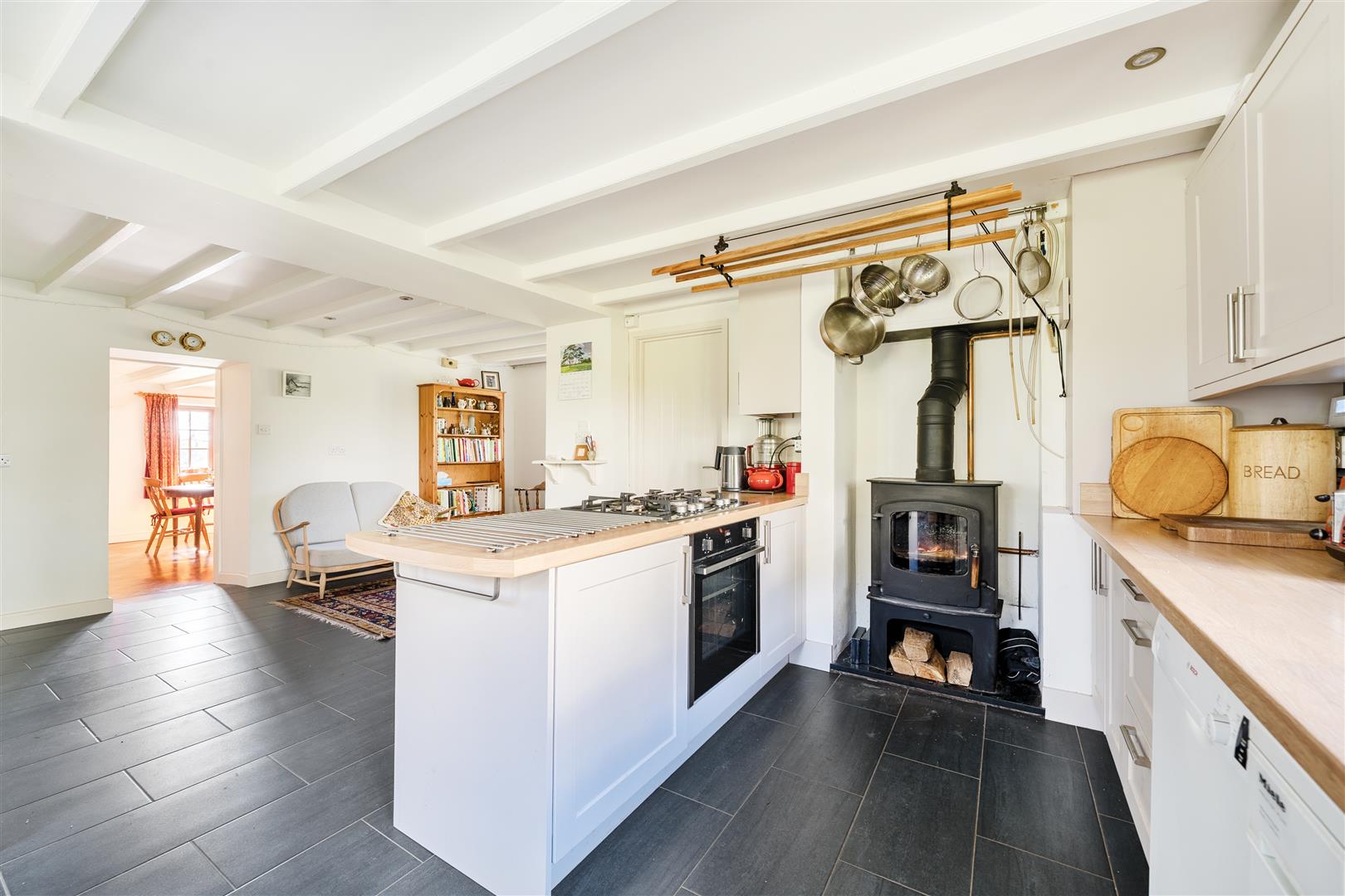 An open plan farmhouse style kitchen & breakfast room with white beamed ceilings and attractive grey floor tiling throughout.