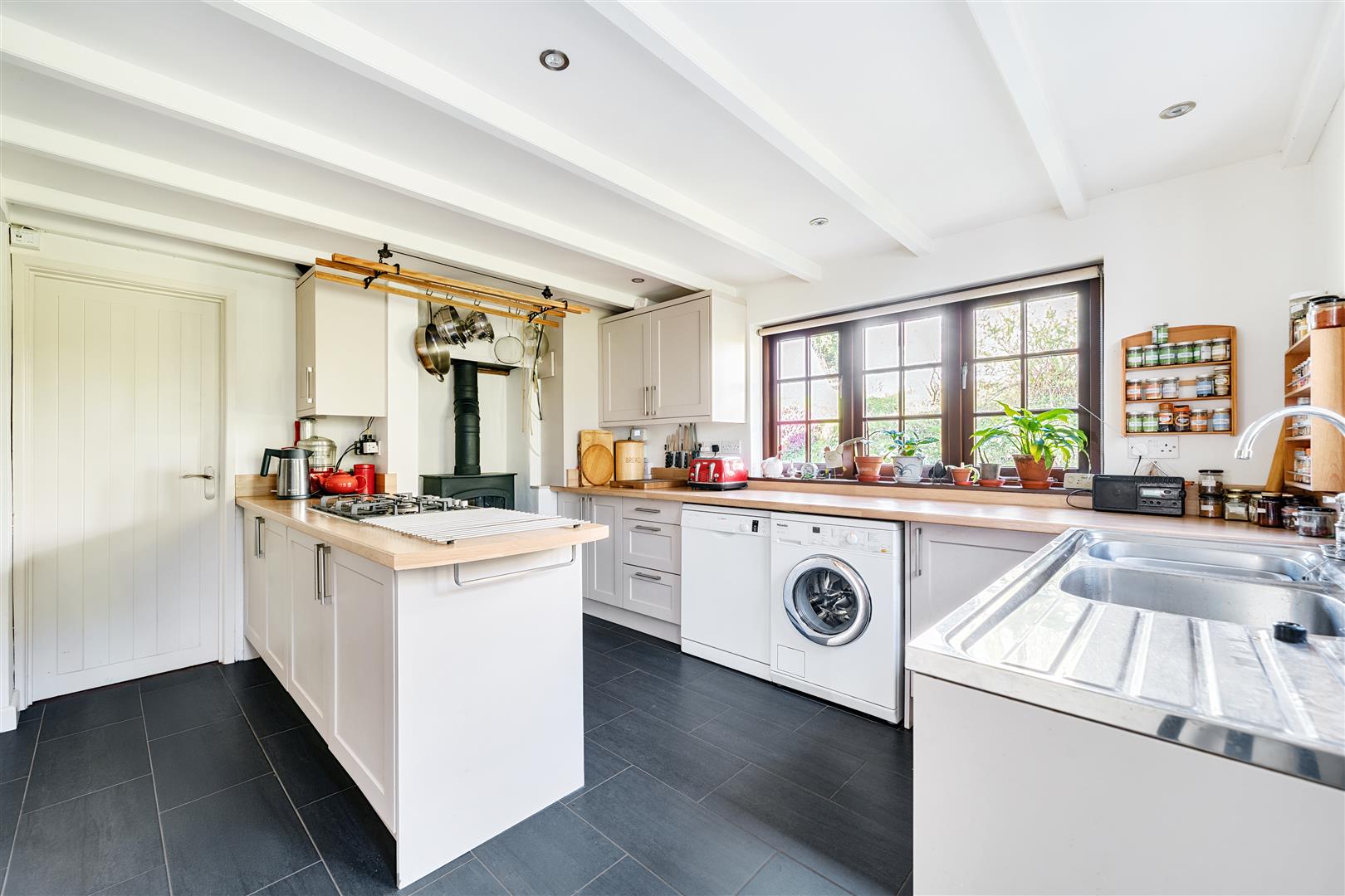 A beautifully appointed modern kitchen, fitted with a range of base units, drawers and wall cupboards. Attractive wood effect working top surfaces incorporate twin stainless steel sinks with drainer and Swans neck mixer tap over and an AEG five ring gas hob. There is an integrated electric oven, whilst spaces are provided for a dishwasher and washing machine. With an impressive fireplace housing a log burning stove set upon a slate hearth with a back boiler. There is a recessed spotlighting, an electric consumer unit and windows to the side and reared aspects.