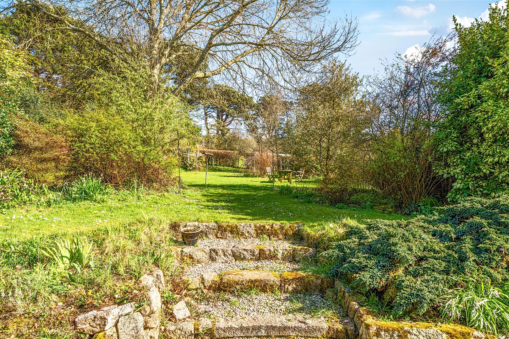 Steps lead down to a delightful stone chipped area which would seem an ideal place in which to sit out and enjoy the magnificent gardens.