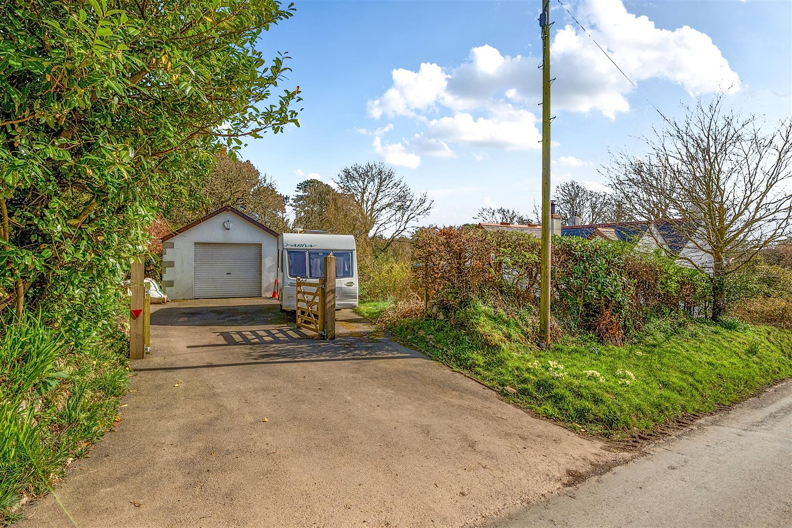 Wooden five bar entrance gates open into the driveway which provides off road parking for a number of vehicles and leads on to the garage.