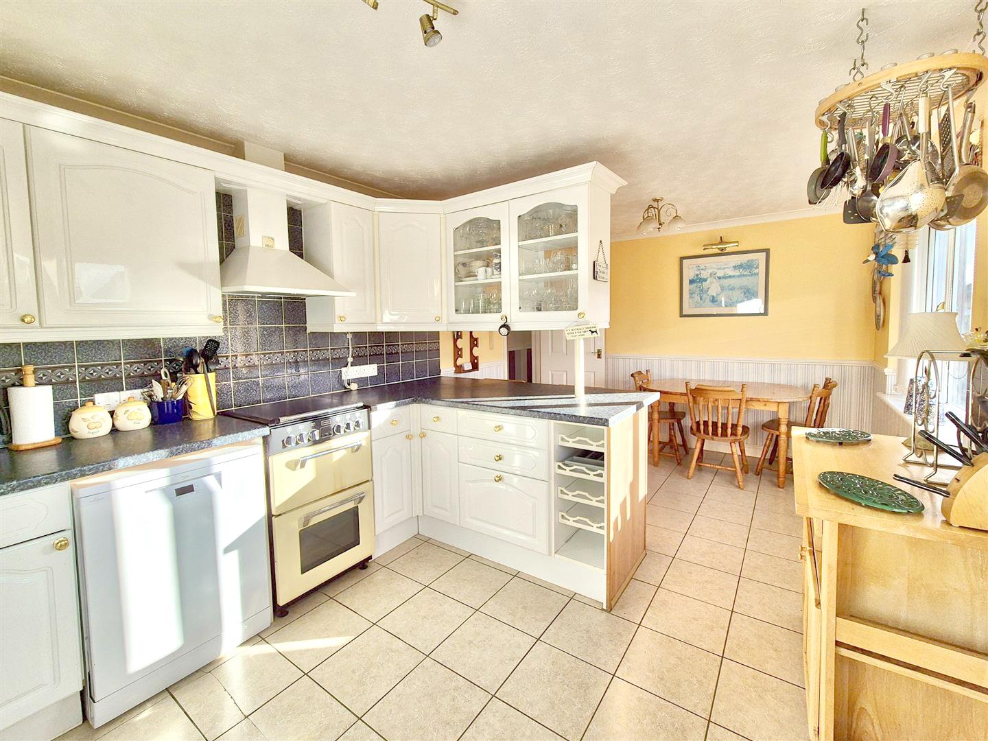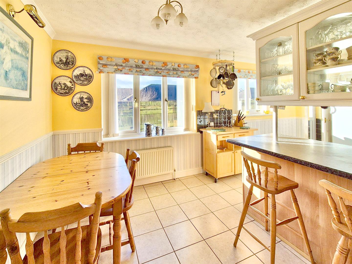 A good size kitchen/diner with outlook to the side and having a tiled floor. The kitchen area comprising working top surfaces incorporating a one and a half bowl sink unit with drainer and mixer tap over, cupboards and drawers under and wall cupboards over. There is space for an oven with hood over, dishwasher, space for floor standing fridge freezer and the kitchen also provides a central breakfast bar area. Door to