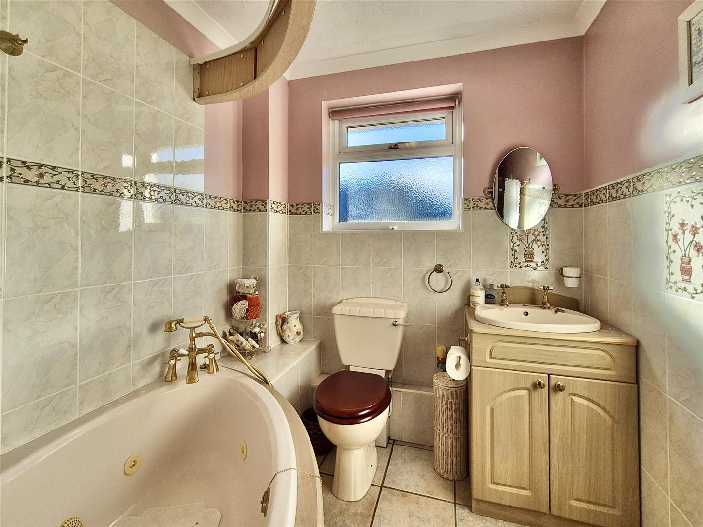Accessed from the hallway and comprising a corner jacuzzi style bath with mixer tap, flexible shower hose and shower over, close coupled W.C. and a wash basin with surround and cupboards under. There are partially tiled walls, tiled floor and a frosted window to the rear.