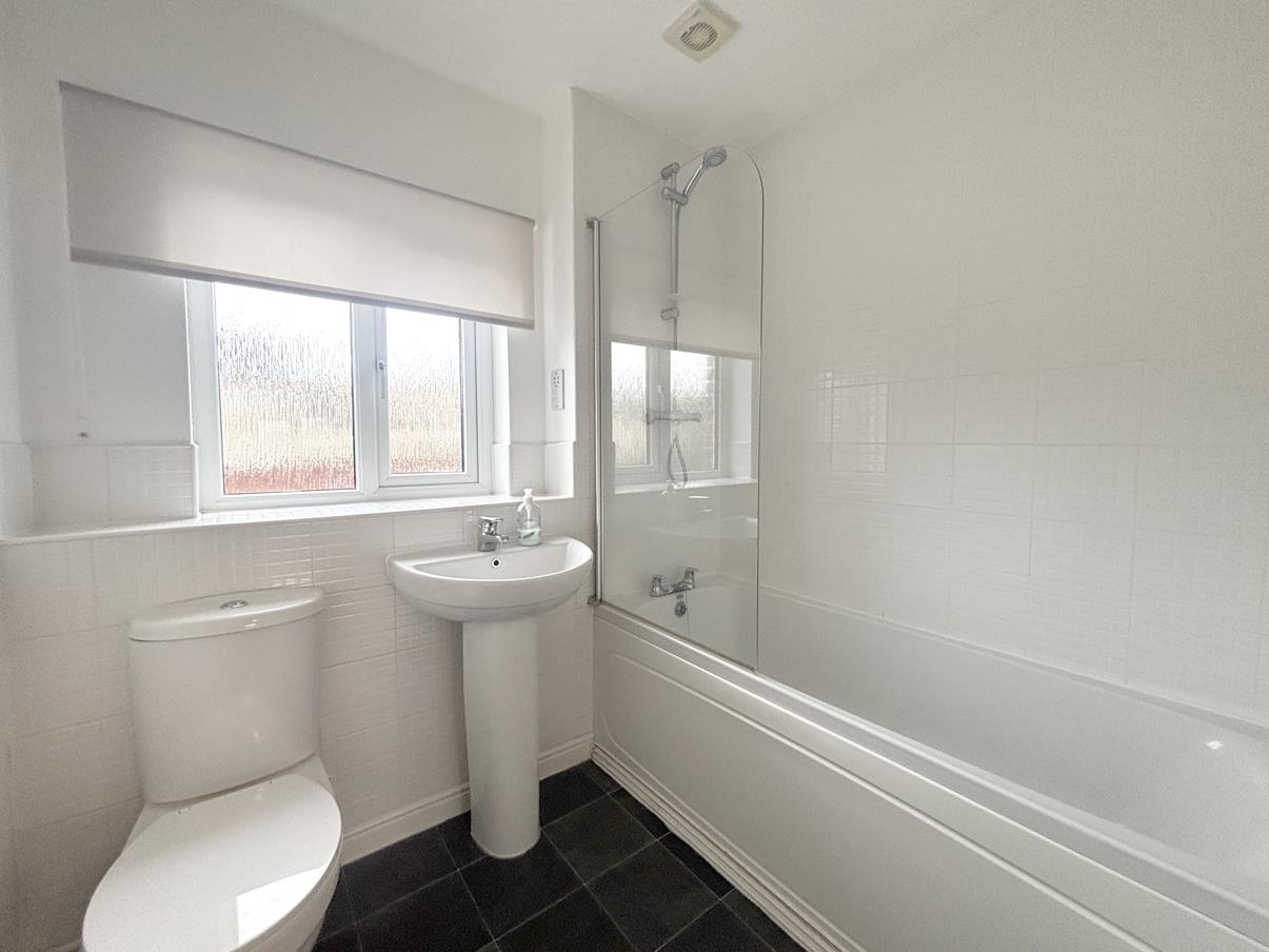 With suite comprising of a bath with tiled surround and chrome effect domestic hot water shower, pedestal wash hand basin, low level W.C., obscured window to front and extractor.