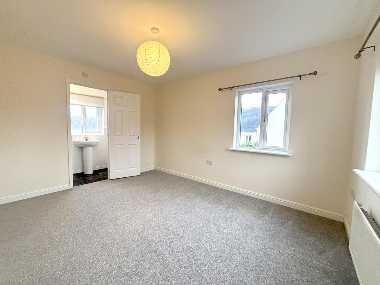 A spacious and light dual aspect master bedroom with fitted carpet, windows to front and side, radiator and door to