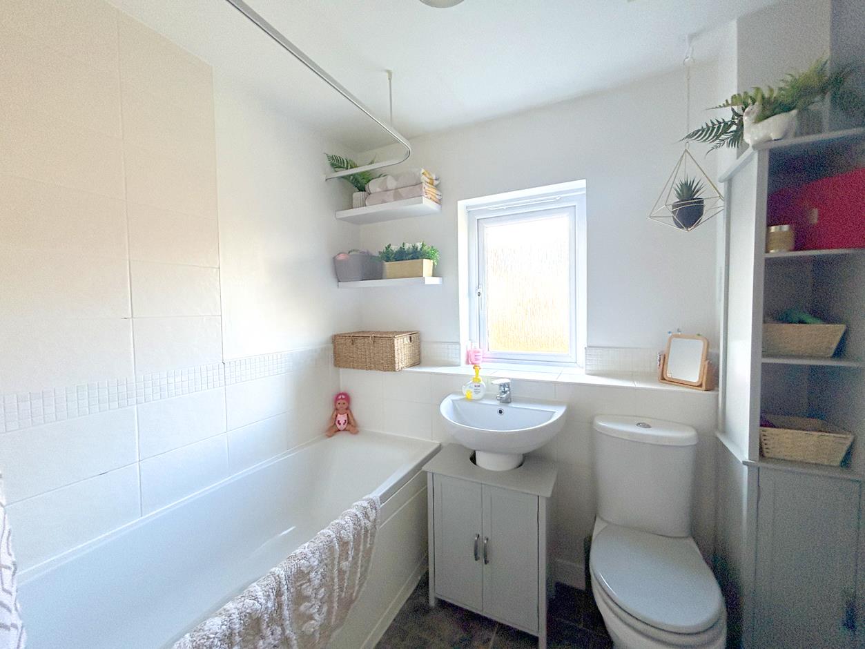 With tiled floor and suite comprising of a bath with tiled surround with domestic hot water shower over, pedestal wash hand basin and low level W.C., chrome effect ladder style radiator and obscured window to the rear.