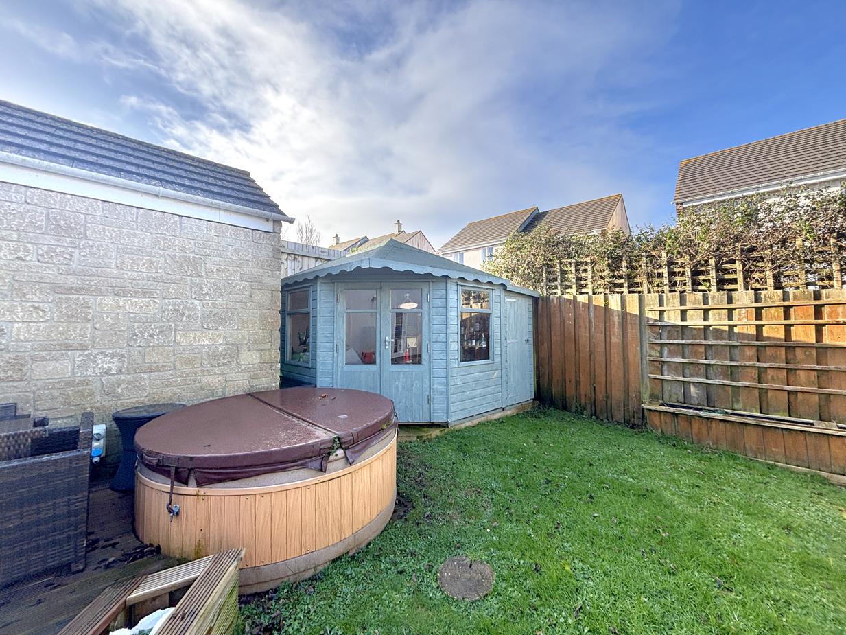 Outside, the rear garden is another standout feature. Level and enclosed, it offers a large decked seating area, a lawn ideal for children and pets, and a summerhouse currently used as a bar, creating a brilliant space for relaxing or entertaining.