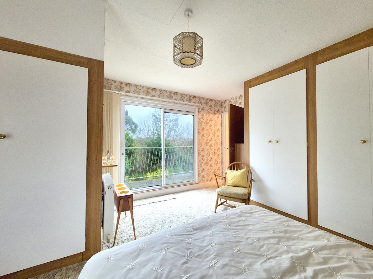 A dual aspect room with an outlook to the rear and side. There is an array of built-in cupboards and a patio door opens onto a pleasant balcony area, which would seem ideal for a morning coffee.