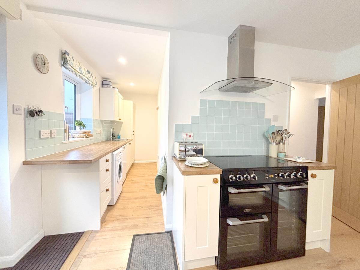 A lovely dual aspect room with windows to side and rear overlooking the garden and door accessing the rear garden. Fitted with a shaker style kitchen with butcher's block effect work surfaces over with one and a half bowl stainless steel sink, drainer and mixer tap, space and point for fridge/freezer, Cuisine Master Leisure range style oven with filter and light above, space for dining table. Open plan to utility area.