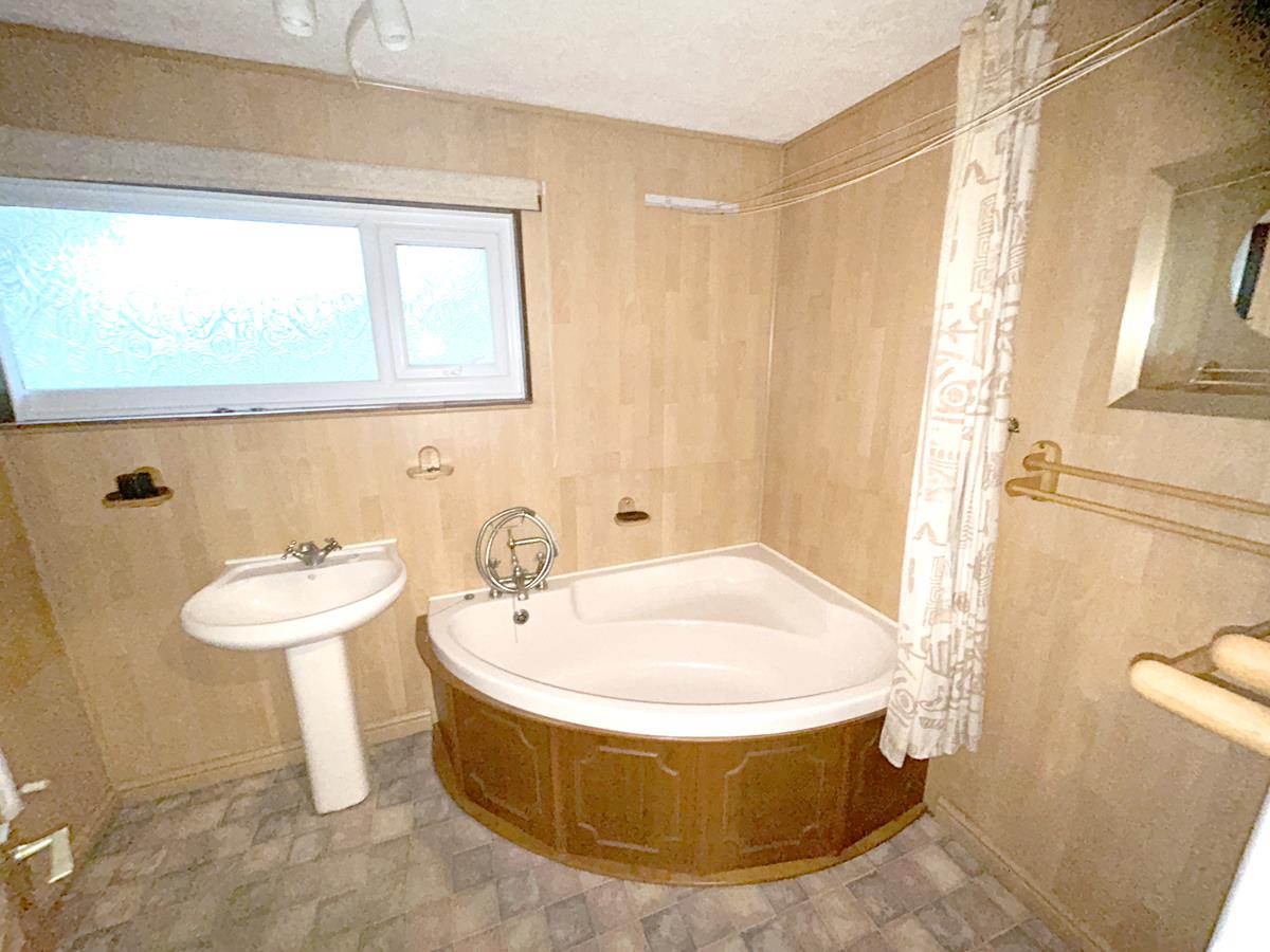 Comprising a corner bath with seat and shower attachment, pedestal wash hand basin, spotlighting arrangement, corner storage cupboards and an obscure glazed window to the front aspect.