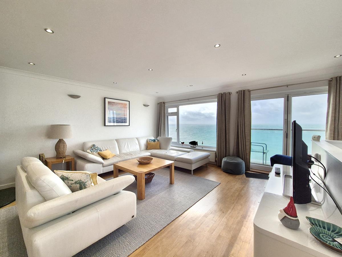 With outlook to the front and out to sea. There are stairs to the first floor, understairs cupboard, tiled floor, doors to all bedrooms and door to
