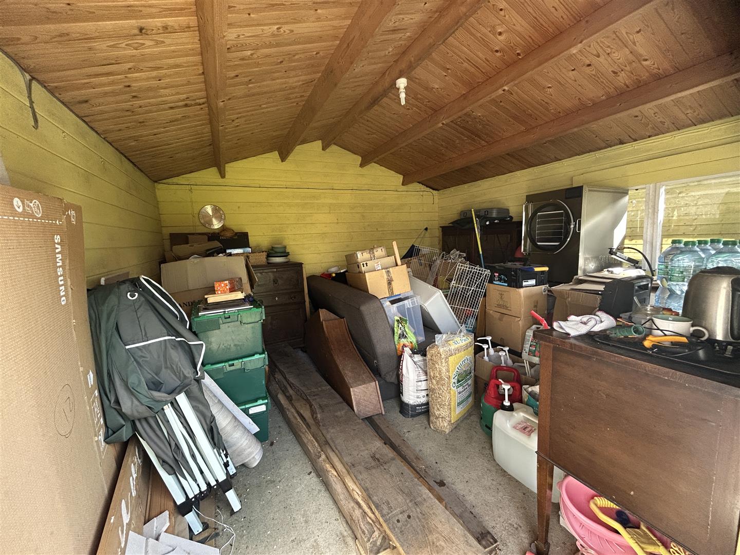 A step leads down from the dining area to the rear patio and garden, which is neatly enclosed with an area of lawn and an adjacent border hosting plants and shrubs. Beyond this is a further area of patio with a summer house which has power and light.