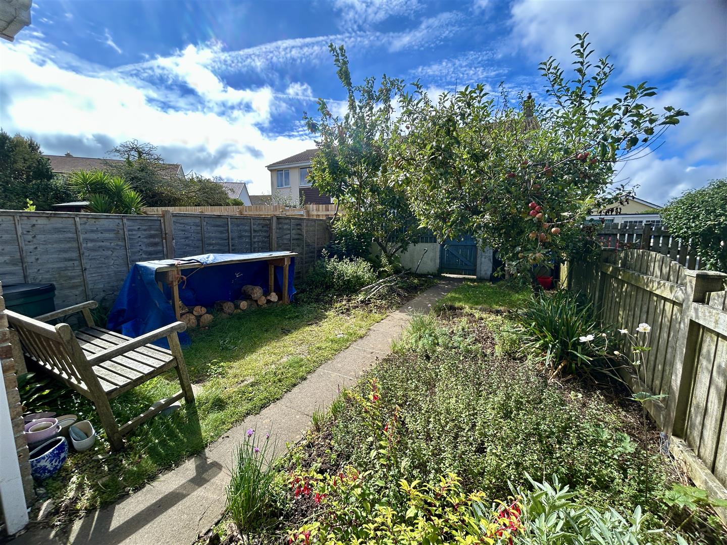A gate open out into the front garden from where a pathway leads up to the front doorstop. There is an area for recycling and an area of lawn with borders to the side.